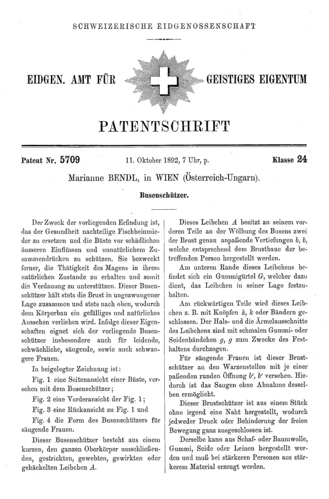 Vor dem Hintergrund dieser gesellschaftlichen Moderichtlinien ist die Erfindung einer in Wien ansässigen Kleidermacherin und Unternehmerin umso erstaunlicher. Marianne Bendl meldete am 7. Oktober 1892 das k.k. Patent des sogenannten „Busenschützers“ an und setzte damit gewissermaßen einen Kontrapunkt zum Wespentaille-Diktat. Ihre Erfindung sollte die Frauen von ihren „Panzerkorsetts“ befreien, ihnen ausreichend Bewegungsfreiheit und Tragekomfort bieten.