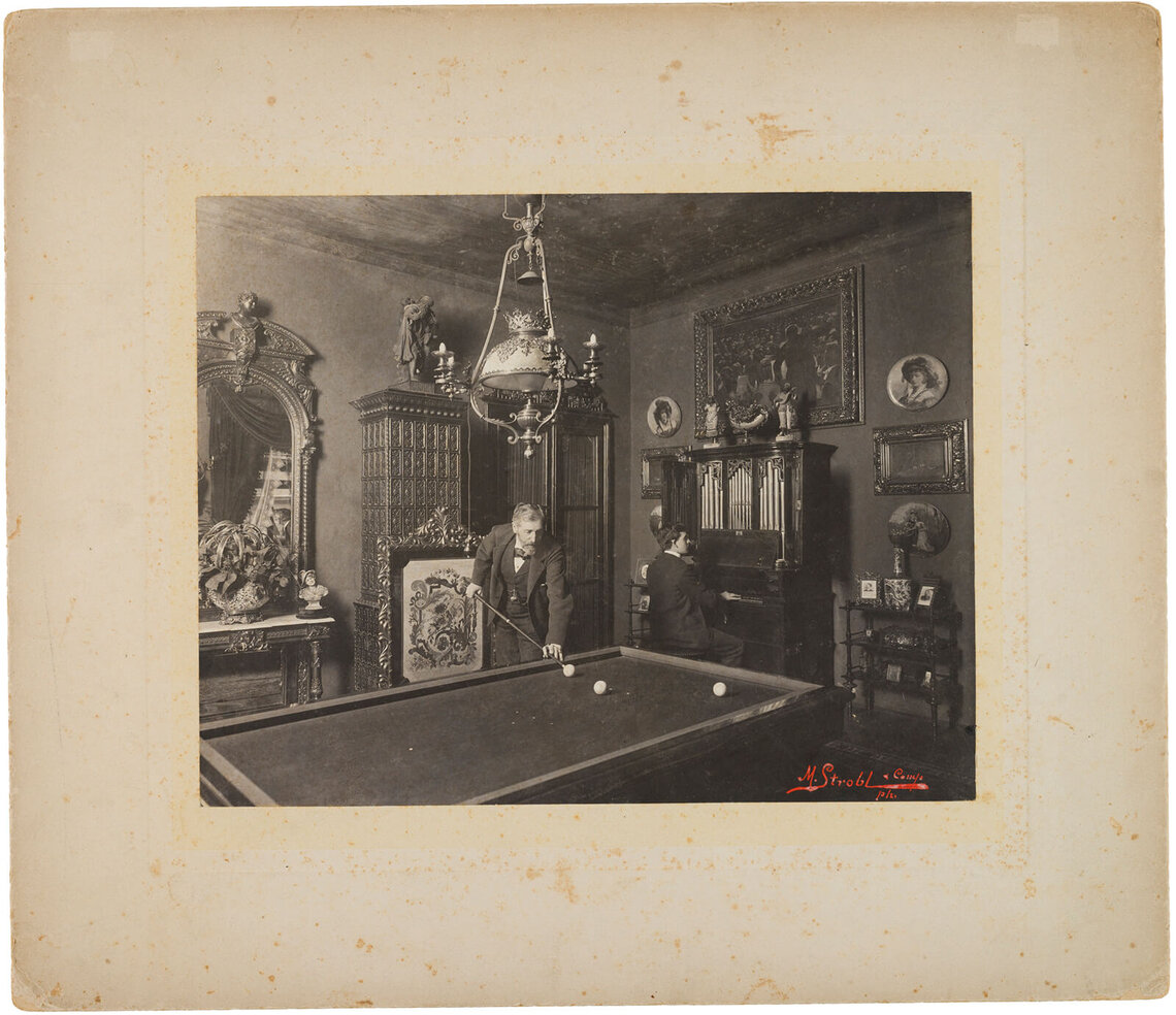 Wohnung der Familie Berg im „Schönbrunnerhaus“ in der Wollzeile 8 vor dem Abriss. An der Zimmerorgel der spätere Komponist Alban Berg, am Billardtisch sein Vater Conrad, 1898, Alban Berg-Stiftung