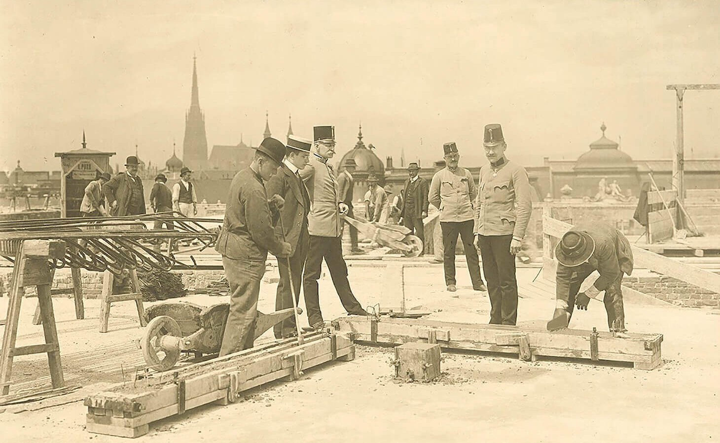 Bau des Hauptsammelkanals (Ausschnitt): Kreuzung des Holzprovisoriums der Verbindungsbahn, 1898, Wiener Stadt- und Landesarchiv.