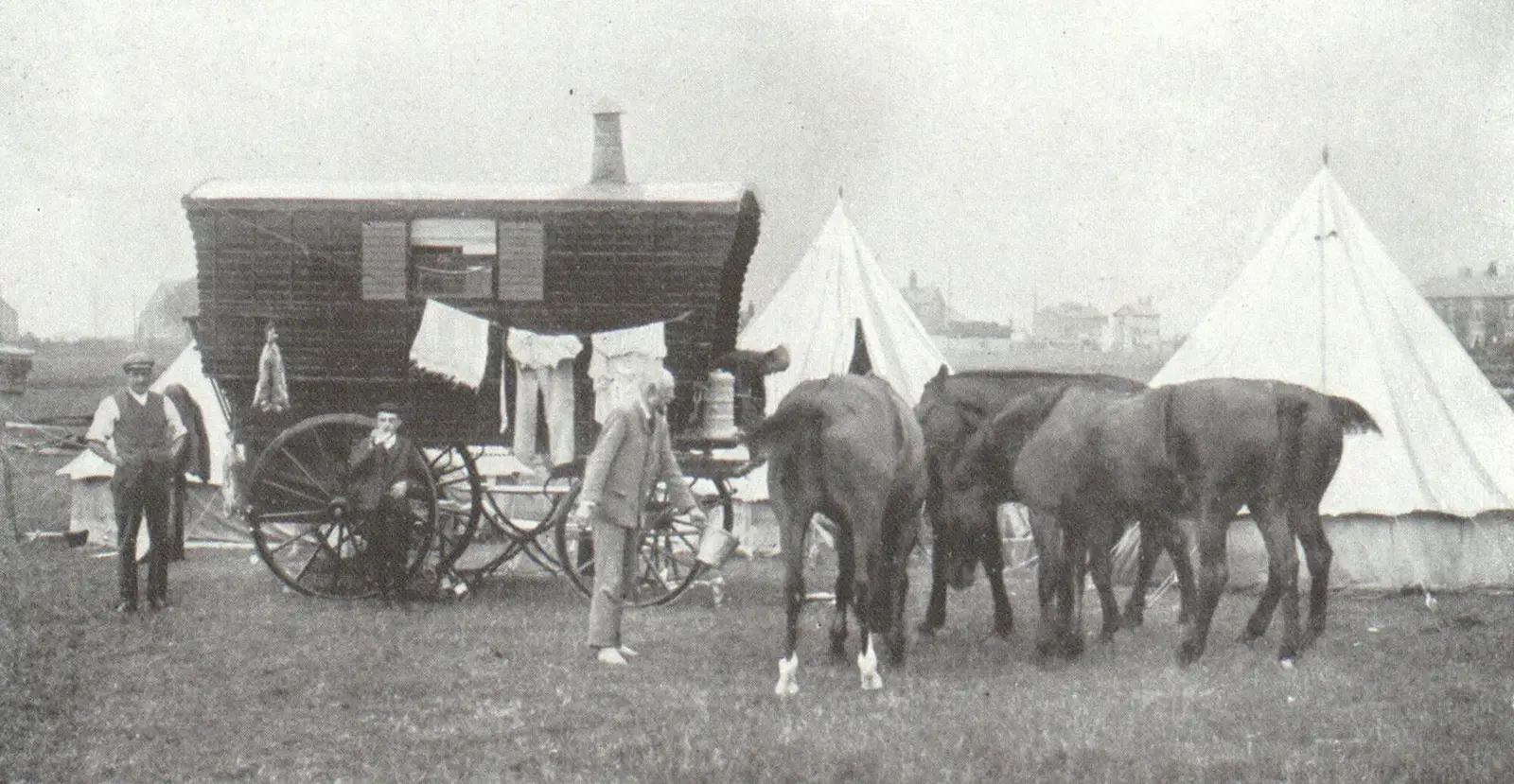 Stets aber meinte Camping das tage- oder wochenweise Leben und Übernachten im Freien beziehungsweise im Grünen, mehr oder weniger fernab von dicht besiedeltem Gebiet, häufig kombiniert mit sportlichen Betätigungen wie Schwimmen, Paddeln oder Bergsteigen. Zum Übernachten dienten Zelte, für das leibliche Wohl sorgte der Proviant, und für die Wärme sowie die Zubereitung der mitgebrachten oder vor Ort selbst gesammelten respektive erjagten Nahrungsmittel das Lagerfeuer. Manche reiche Engländer und Amerikaner übernachteten statt in Zelten in von Pferden gezogenen Wohnwägen, die als Caravan bezeichnet wurden.