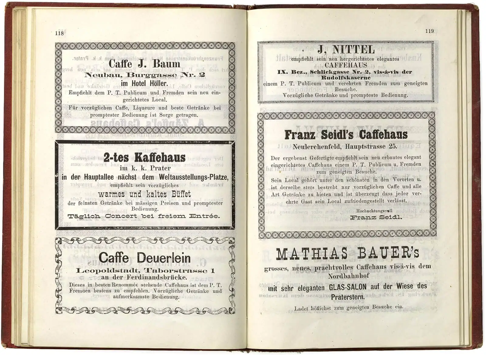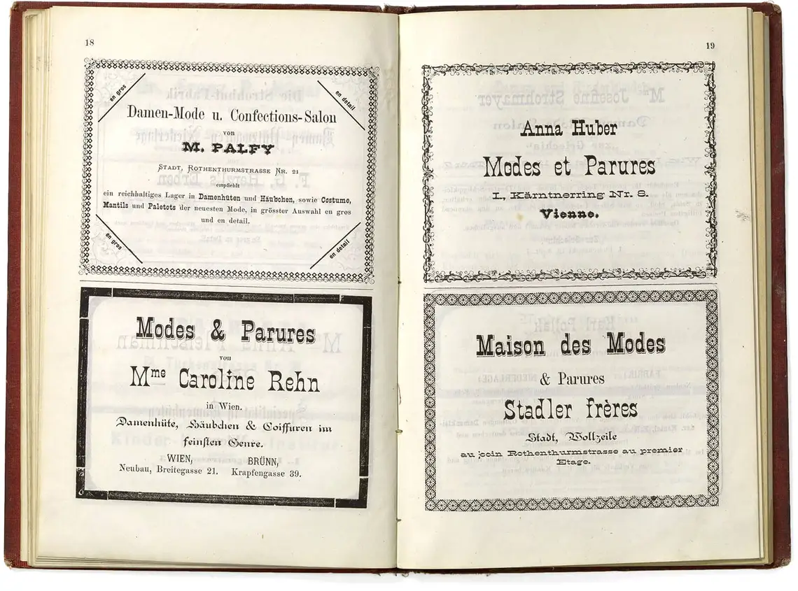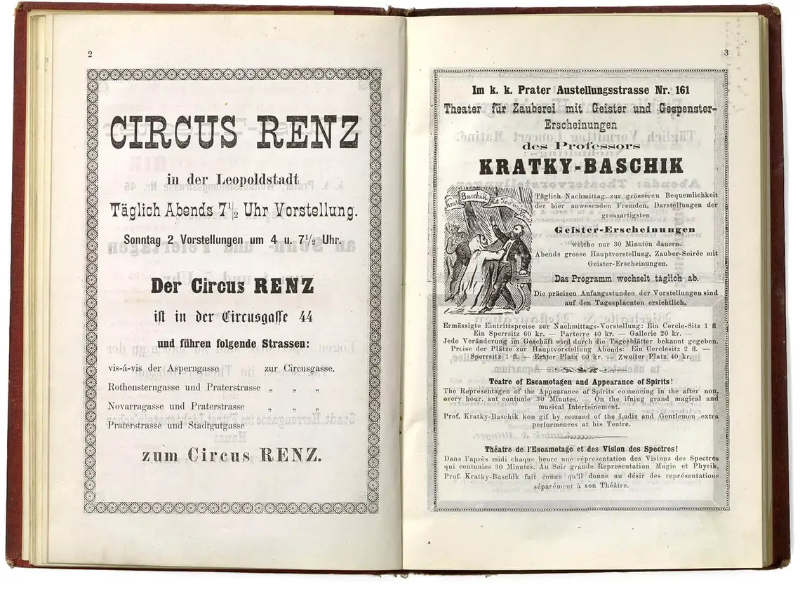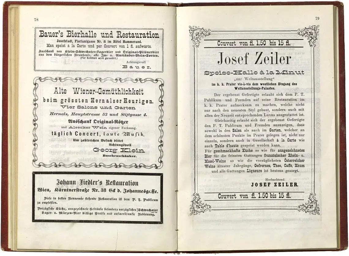 Doppelseiten aus P. Kron’s Wiener Weltausstellungs Fremden-Führer für 1873. Herausgegeben von P. Kron. Wien, 1. Mai 1873. Im Selbstverlag des Herausgebers, Wien Museum