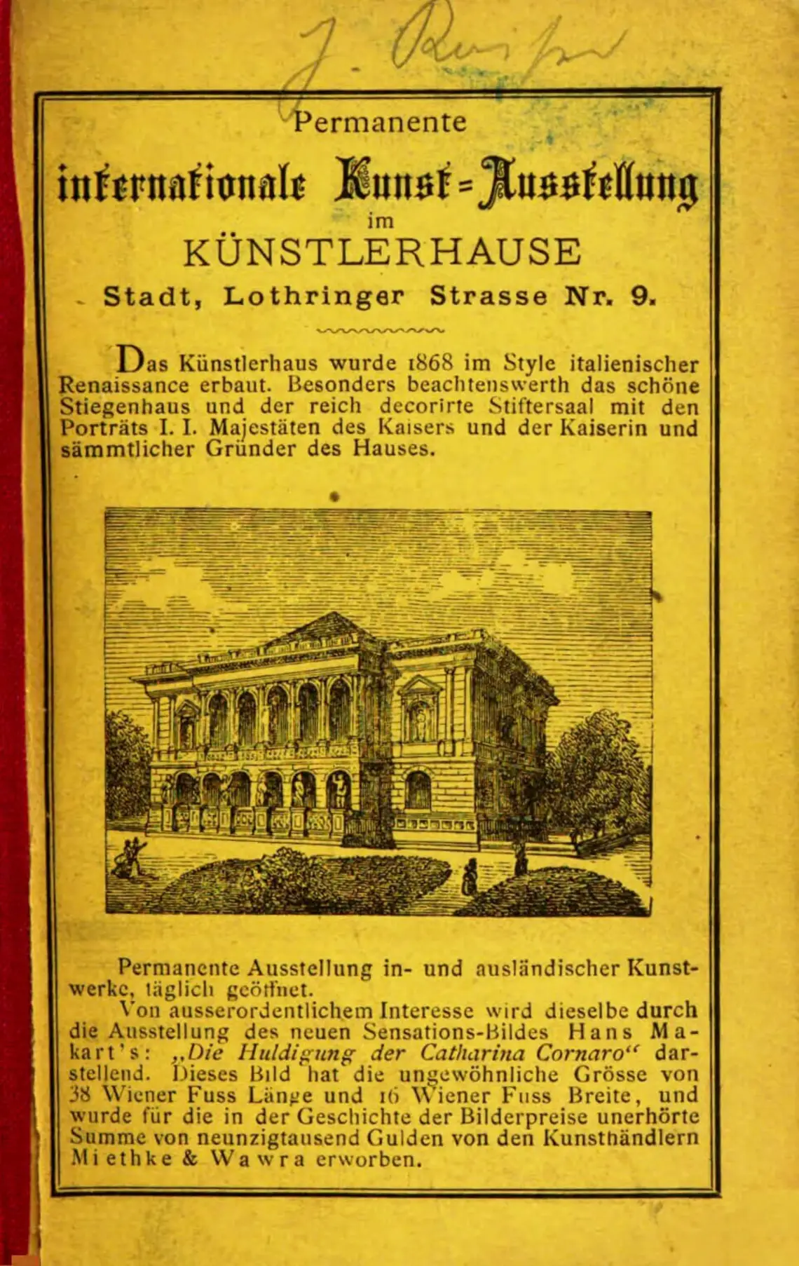 Nicht nur der eigentliche Führer war für Fremde interessant, auch die beigebundenen Annoncen waren teilweise instruktive Handreichungen für die Touristinnen und Touristen. So machte etwa das Künstlerhaus auf die Ausstellung von Hans Makarts Großgemälde Die Huldigung der Caterina Cornaro in seinem Haus während der Weltausstellung aufmerksam, dass von den Kunsthändlern Miethke & Wawra um 90.000 Gulden erworben wurde. Tatsächlich bildeten sich vor dem Künstlerhaus Menschenschlangen, die dieses Riesengemälde des damaligen Maler-Superstars sehen wollten. Dieser Wiener Baedeker erschien im Jahr der Weltausstellung auch in einer englischen Edition als Handy-Guide to Vienna im Londoner Verlag Longmans & Co.