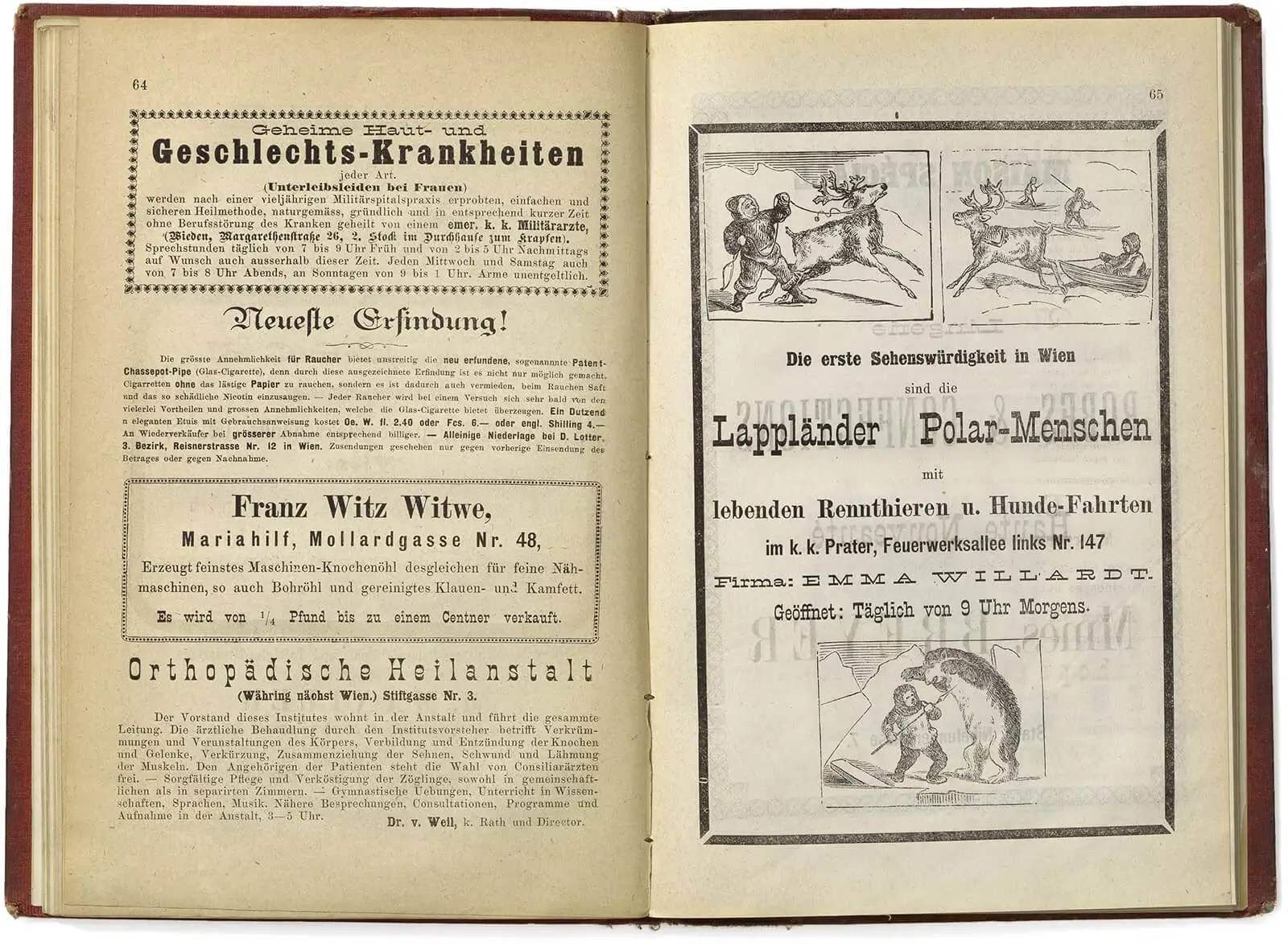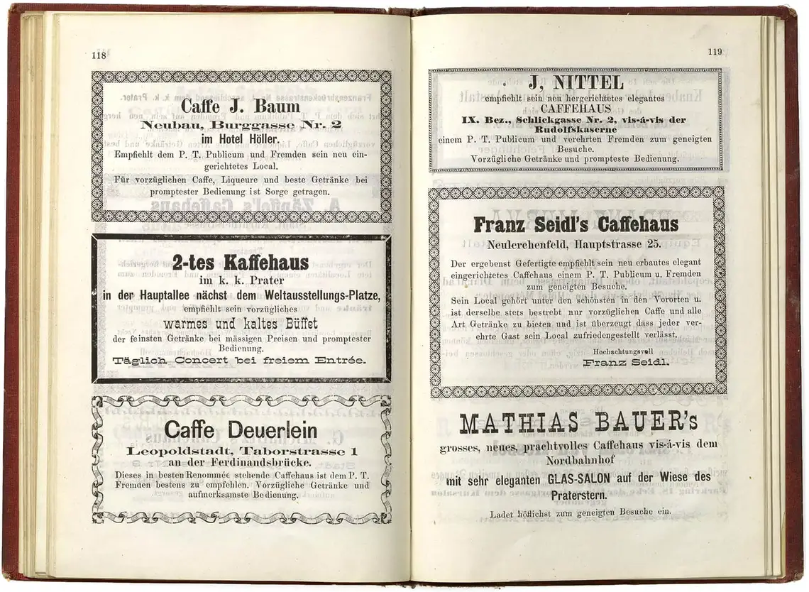 Dazu kamen Reisebücher, die fast prophetischen Charakter hatten und in denen man Anzeigen zur Vorbeugung gegen die Cholera finden konnte. Im konkreten Fall die Liechtenthaler Bitter-Liqueur-Essenz, die „schon Wunder gewirkt hat, indem es Personen, die von der Cholera befallen und selbst von den Ärzten schon aufgegeben waren, dem sicheren Tod entriss“. Den Ausbruch der Cholera konnte sie dann doch nicht verhindern. Wohlbekannte Klischees durften bei der Beschreibung der Charaktereigenschaften der Wiener und Wienerinnen nicht fehlen: „Während der Engländer und speciell Londoner kalt, ruhig und berechnend, der Pariser leichtfertig und oberflächlich, der Berliner kühl und zurückhaltend, ist der Ausdruck der Wiener Bevölkerung vorwiegend gemüthlich und zutraulich.“ Für Besucherinnen und Besucher mit norddeutschem Akzent gab es einen ganz besonderen Tipp, nämlich politischen Konversationen auszuweichen, „damit nicht der durch unangenehme Rückerinnerungen hervorgerufene Unmuth die frohe Laune verscheuche“. Gemeint war damit die beschämende militärische Niederlage von Königgrätz 1866 gegen Preußen.