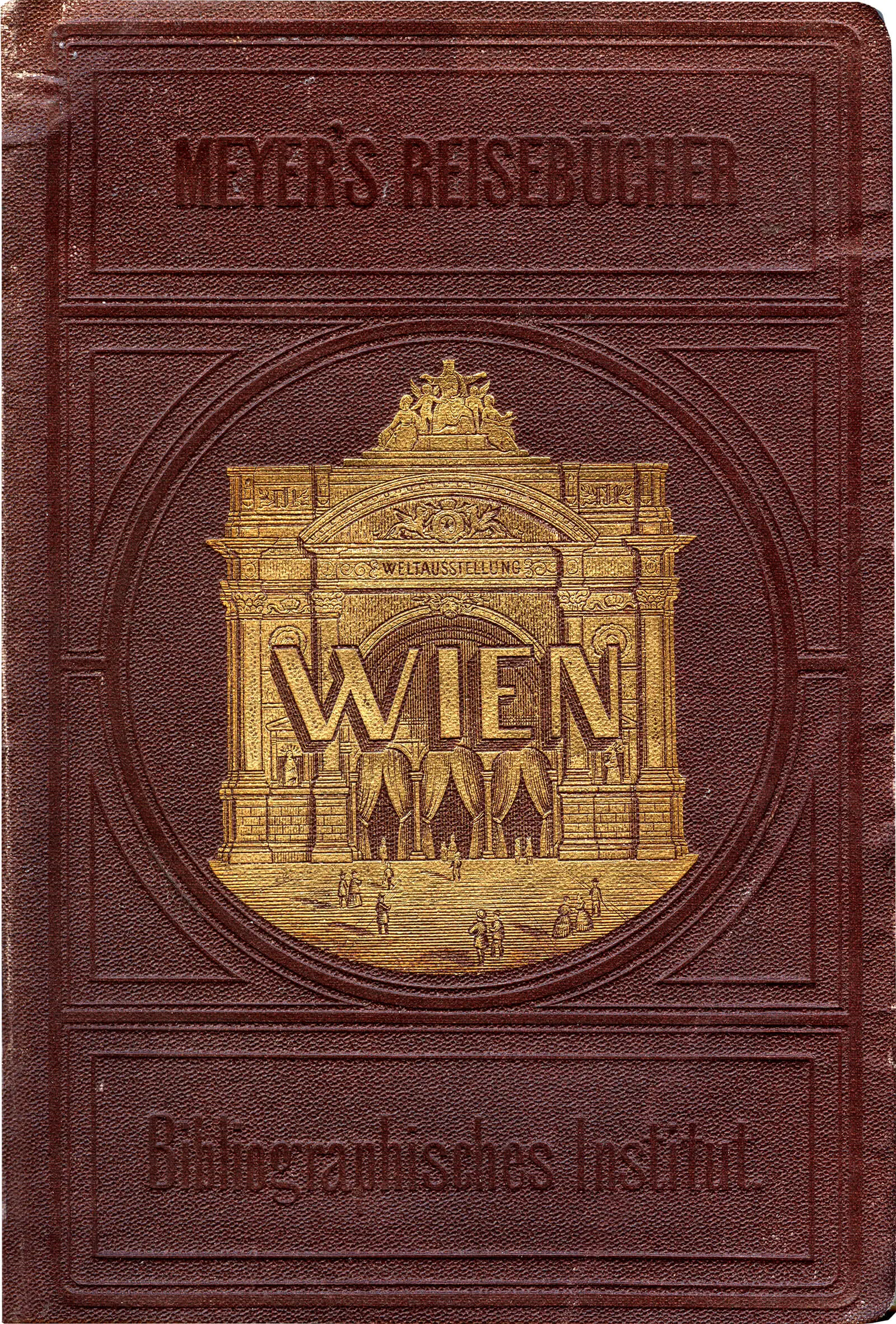 Ersteres war eine umfangreiche Publikation von Baedekers schärfstem Konkurrenten, dem von Joseph Meyer 1826 in Gotha gegründeten Bibliographischen Institut. Wenn man nicht das Buchcover oder das Titelblatt vor Augen hat, konnte und kann man diesen Führer nicht von einem Baedeker unterscheiden. Das erste dieser Meyer’schen Reisebücher erschien 1862 für die Schweiz. Diese braun gebundenen Tourismusführer sollten nach den roten Baedekern die erfolgreichsten Publikationen ihrer Art werden. Nur die äußere Aufmachung deutet auf die Besonderheit des Anlasses hin, sind doch am Cover das Haupteingangsportal der Weltausstellung in Gold geprägt, am Vorsatzblatt ein Wien-Plan mit dem hervorgehobenen Ausstellungsgelände und auf dem Frontispiz ein Kupferstich vom „Weltausstellungspalast“ zu finden. Der in Wien beheimatete Autor Franz Stehlik schreibt im Vorwort vom Mai 1873 verärgert, dass man bei der Erstellung eines solchen Spezialführers nicht mit der Unterstützung des Weltausstellungsbüros rechnen dürfe, obwohl es Werbung für die Veranstaltung wäre, sind doch „meine beharrlichen Bemühungen bei der Generaldirektion der Wiener Weltausstellung von Anfang bis zu Ende gänzlich fruchtlos geblieben. Der Herr Präsidialreferent hat mich wochenlang mit leeren Versprechungen hingehalten und mich so rücksichtslos um einen guten Theil meiner kostbaren Zeit gebracht.“ Dem Führer vorangestellt sind gelbe Seiten mit detaillierten Fahrpreisen und der Fahrtdauer für die Anreise mit Bahn und Schiff. 18 Stunden benötigte man etwa für die Fahrt von Berlin nach Wien. Aus diesen Plänen geht auch hervor, dass der Führer explizit für ein deutsches Publikum geschrieben wurde, da zum Beispiel die Anreise aus der Schweiz nicht erwähnt wird.