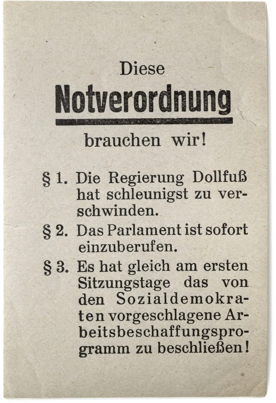 Anfang Oktober dieses Jahres testete die Regierung mit dem Einsatz des Kriegswirtschaftlichen Ermächtigungsgesetzes an einer eigentlich wenig brisanten Angelegenheit die Reaktionen der Opposition auf diktatorische Maßnahmen, insbesondere jene der Sozialdemokratischen Partei. Deren Abgeordnete reagierten alarmiert, sprachen die Intentionen der Regierung als „Verfassungsbruch“ klar an, appellierten an den Bundespräsidenten Wilhelm Miklas und forderten ihre Wählerschaft auf, „sich zur Verteidigung des demokratischen Kampfbodens der Arbeiterklasse und der gewerkschaftlichen Rechte der Arbeiterklasse bereitzuhalten“.