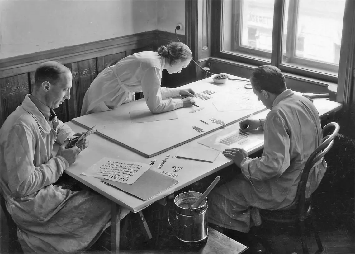 Die visuelle Bildungsarbeit war freilich nicht die Arbeit Neuraths allein, sondern immer die Arbeit eines Teams, von Menschen aus unterschiedlichen Wissenschaften, aus Grafik, Handwerk und Kunst. Von Beginn an wirkte die deutsche Naturwissenschaftlerin und technische Zeichnerin Marie Reidemeister mit, die für die „Transformation“ verantwortlich zeichnen sollte. Damit war ein Arbeitsprozess des Analysierens, des Auswählens und Ordnens gemeint, in dem schließlich Informationen, Daten und Zusammenhänge visualisiert, sichtbar gemacht werden. Sie selbst bezeichnete diese Tätigkeit als „Entwurfsarbeit“. Ab 1928 stieß auch der Künstler Gerd Arntz dazu, der 1929 nach Wien kam, die grafische Abteilung des GWM leitete und für die bis heute zeitlose Gestaltung der Piktogramme verantwortlich wurde. Zeitweise arbeiteten bis zu fünfzig Menschen im bildpädagogischen Team.