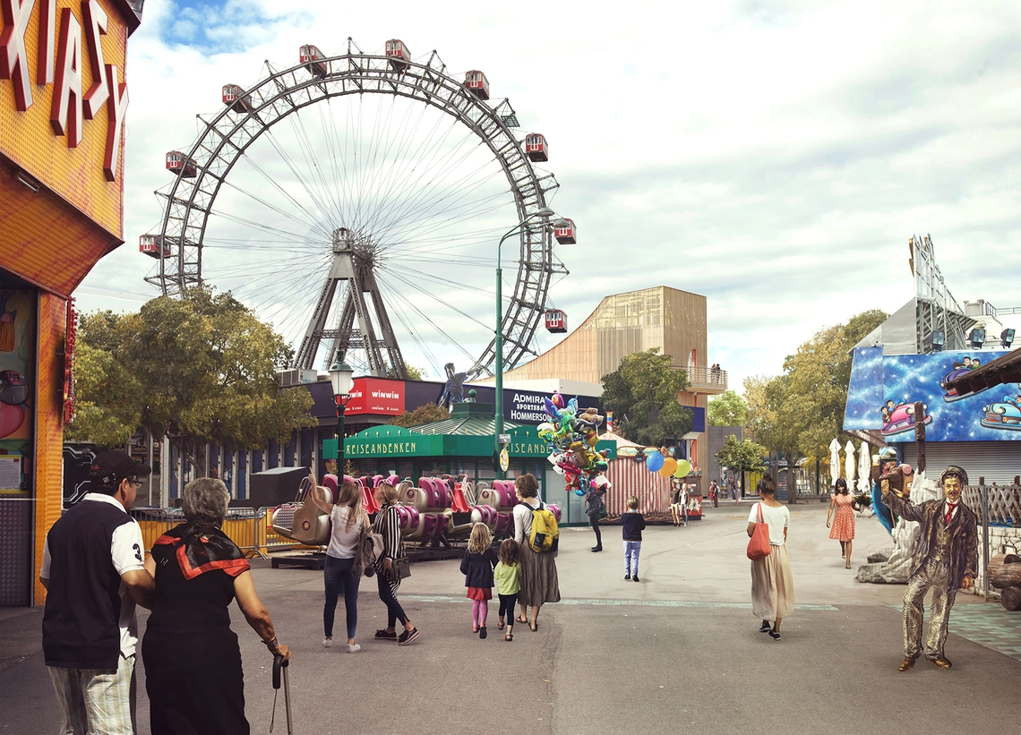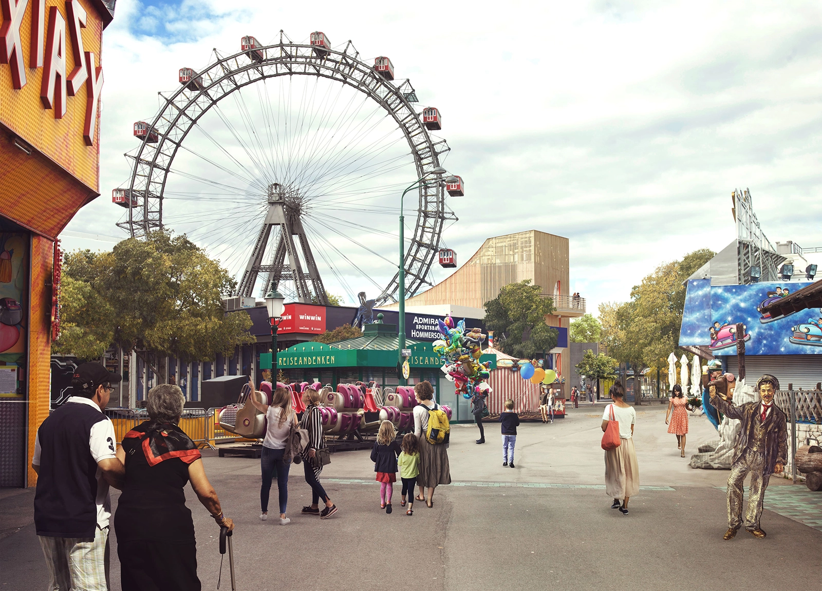 Dadurch war es von Anfang an klar, dass das Museum so einladend und niedrigschwellig wie möglich sein sollte. Der Architekt Michael Wallraff hat das Gebäude dementsprechend und buchstäblich vom Museumseintritt aus konzipiert. Es wird von beiden Seiten (Straße des Ersten Mai und Eduard-Lang-Weg) gleichwertig zu betreten sein, Erdgeschoss bzw. Foyer werden als konsumfreier Raum erhalten bleiben, der auch für kleinere Veranstaltungen genutzt werden kann, für Musikdarbietungen, Kleinkunst oder Flohzirkus und vieles andere mehr. Damit entsteht eine Übergangszone zwischen Innen und Außen, in der dennoch schon ein erster Eindruck von der historischen Vielfalt und Tiefe des Praters geboten werden soll. Das bedeutete gleichzeitig, dass das Museum in die Höhe wachsen muss, in Summe auf zweieinhalb Geschoße und fast 15 Meter, wobei sich die eigentlichen Schauräume im ersten und zweiten Stock befinden werden. Die Form des geschwungenen Daches, um auf das Aussehen zu kommen, ist einem freien Blick auf das Riesenrad geschuldet und greift dessen Rundung auf.
