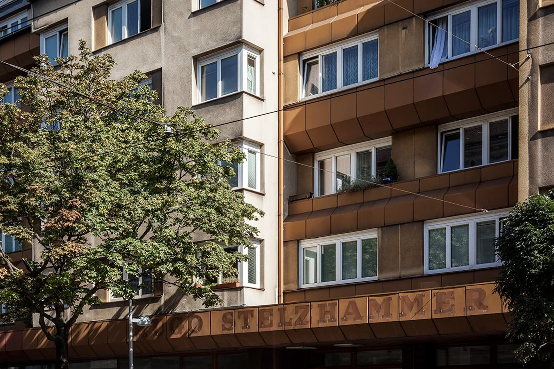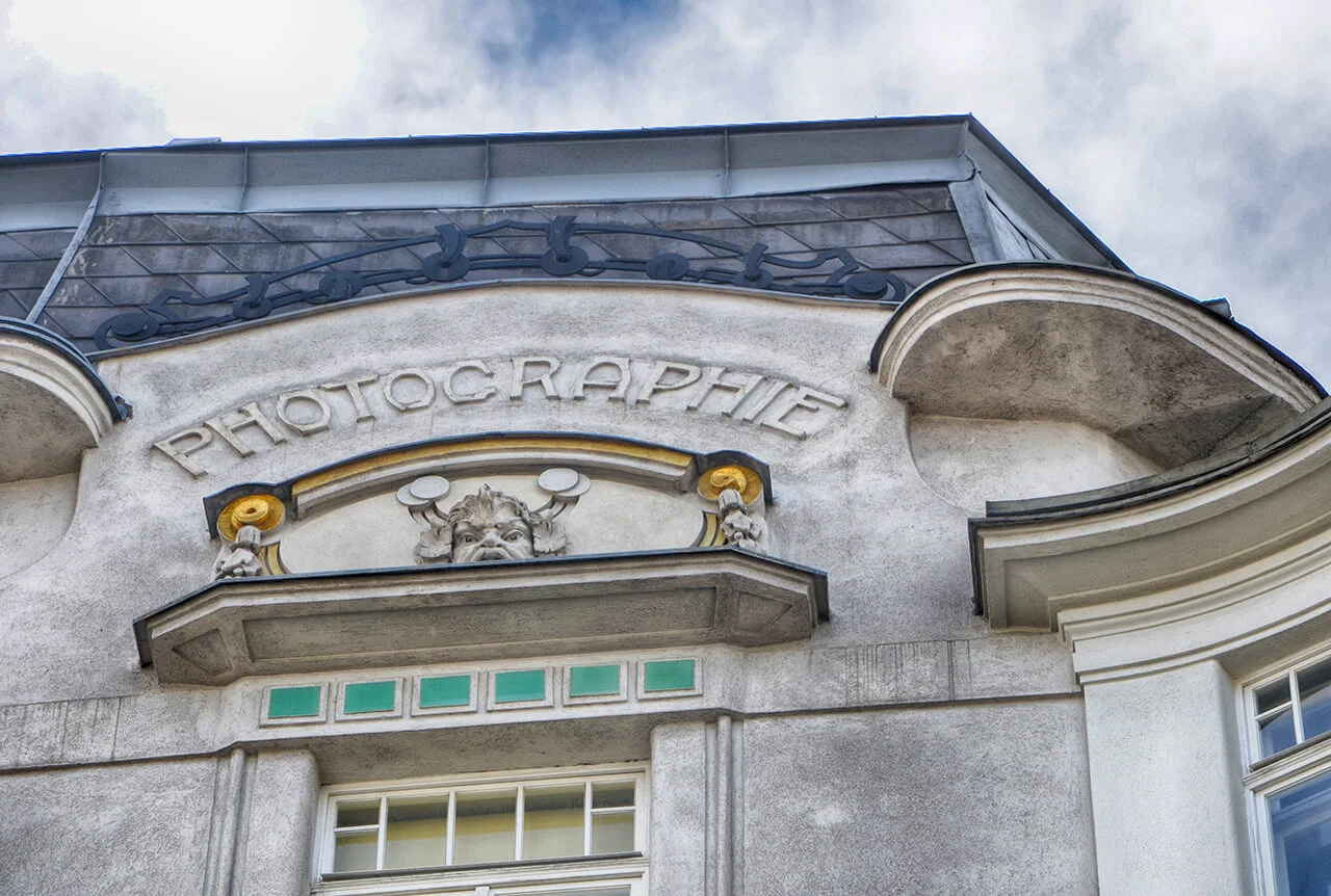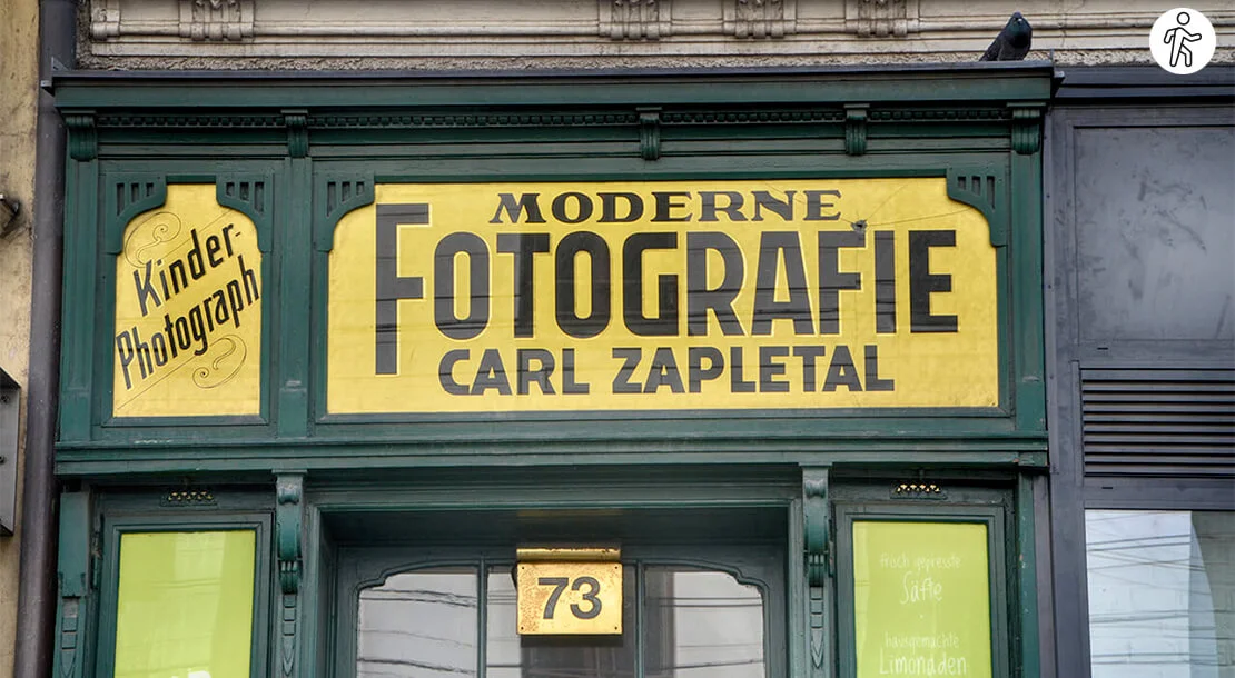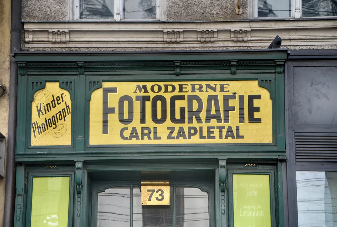 Vom Portal des „Kinder Photographs“ Carl Zapletal ist nicht nur der vergoldete Schriftzug über dem Hauseingang Nr. 73 zu sehen, auch hoch oben an der Fassade findet sich das Wort „Photographie“. Zapletal zog 1923 an diese Adresse, um sich vermehrt der Portraitfotografie zuzuwenden, betrieb hier das Gassenlokal und wohnte auch selbst im Haus.