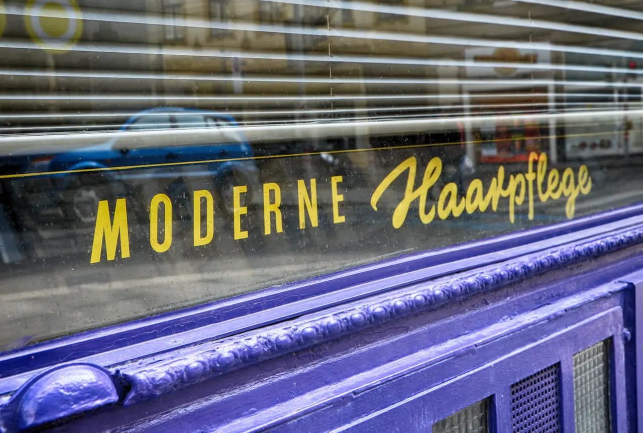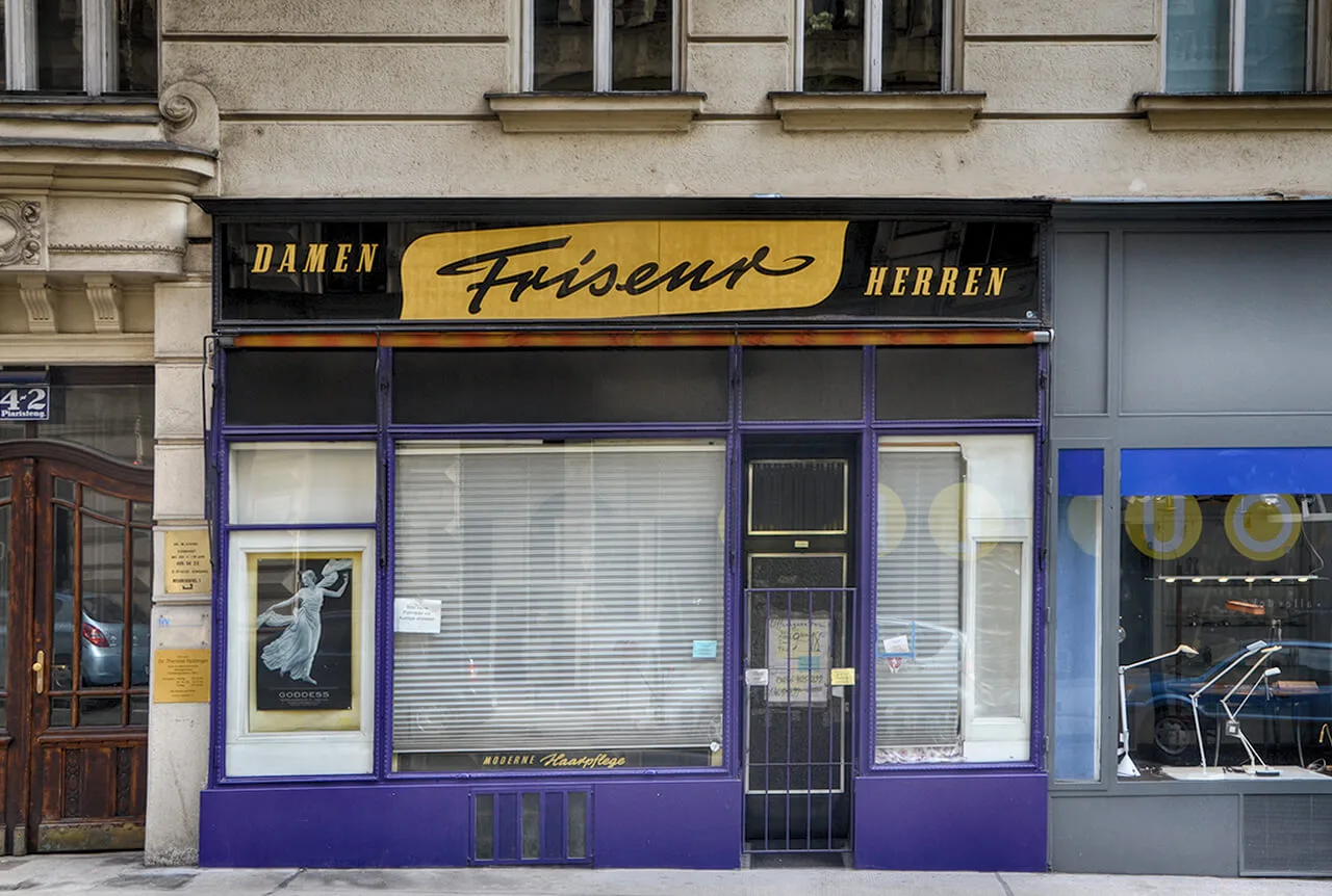 Die meisten Passagiere der Linie 13A kennen das Geschäft mit seinem tollen Portal und dem goldenen Sign wohl nur vom Vorbeifahren. Dabei würde es sich durchaus lohnen reinzusehen, denn es ist nämlich Wiens einziger „Kabinen-Salon“. Inhaberin Christine Endres entstammt einer uralten Friseurdynastie und hat dementsprechend viele Anekdoten zu erzählen. Frau Endres kämpft derzeit gegen die Pläne der Hausverwaltung, das Portal zu erneuern. Die Tage dieses besonders eleganten 1950er Schriftzuges könnten durchaus gezählt sein.