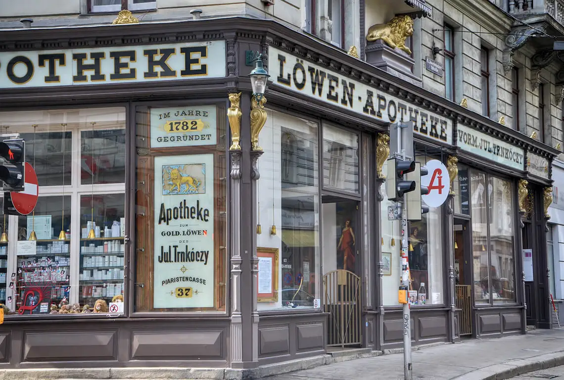 Auch an Kunstsinn mangelte es Moser nicht, als Ladenschilder ließ er Ferdinand Waldmüller vier lebensgroße Gemälde anfertigen. Heute befinden sich die Werke in der Sammlung des Belvedere, Repliken davon sind in den Schaufenstern der Apotheke ausgestellt. Dort ebenfalls zu sehen sind diverse Eigenanfertigungen der späteren Besitzer, der Familie Trnkoczy. Sie hatte die Apotheke 1886 übernommen und mit „Trnkoczy’s Eisenwein“ oder dem vielfach prämierten Likör „Grandol“ einige Berühmtheit erlangt.