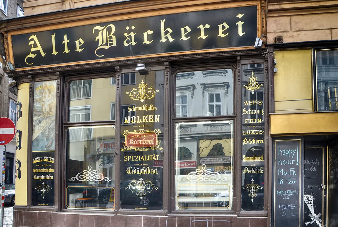 Die detailreichen Beschriftungen des Ecklokals am Fuß des Spittelberg zeugen vom Warenangebot um die Jahrhundertwende. „Schmackhaftes Molken-, echtes Kornbrot und die Spezialität Erdäpfelbrot“ werden da nebst „Mehl und Gries aus den renommiertesten Dampfmühlen“ beworben.