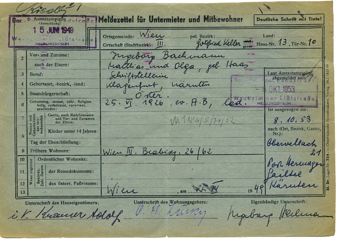 Nur ein Katzensprung vom Café entfernt ist die erste Wiener Wohnadresse der Dichterin, die ab 1946 in der Beatrixgasse 26 logierte, woran eine Gedenktafel erinnert. Bereits ab diesem Jahr veröffentlichte Bachmann Gedichte und Prosa in österreichischen Zeitungen und Zeitschriften. In Wien lernte sie auch Paul Celan kennen, der von Dezember 1947 bis Mitte 1948 hier Zwischenstation machte, ehe er sich in Paris niederließ.