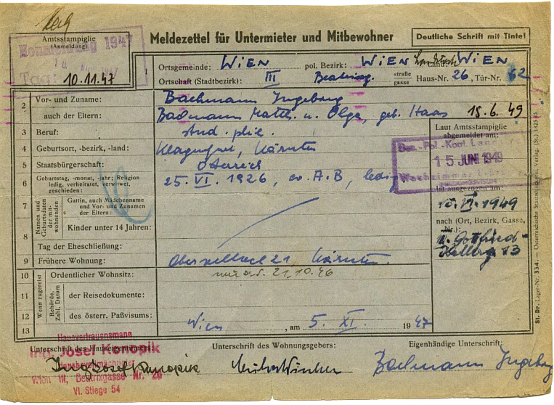Unser Spaziergang führt uns nun – vorbei am zweiten Wiener Wohnort von Ingeborg Bachmann in der Gottfried Keller-Gasse 13, wo sie von 1949 bis zu ihrem Abschied von Wien 1953 lebte – über den Rennweg zur Hohlweggasse 1, wo Aichingers Großmutter mütterlicherseits mit ihren Töchtern Klara und Erna wohnte.