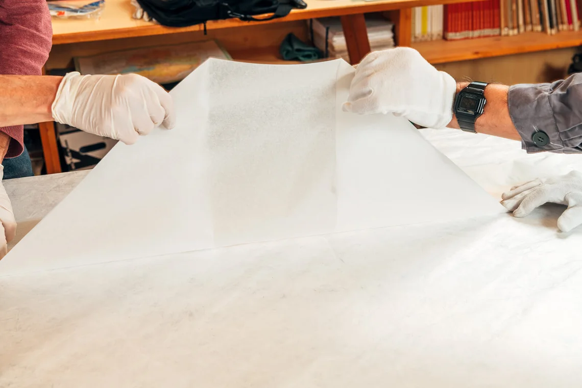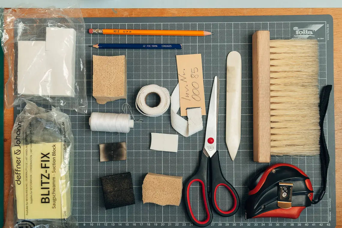 Das Werkzeug für die Versorgung der Objekte: Stück für Stück werden die verschmutzten und beschädigten Textilien versorgt.