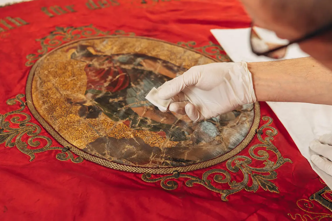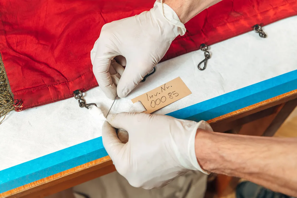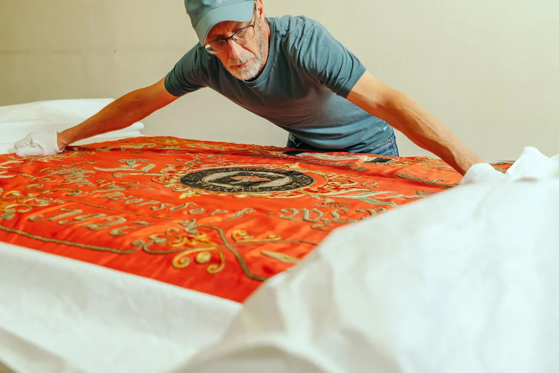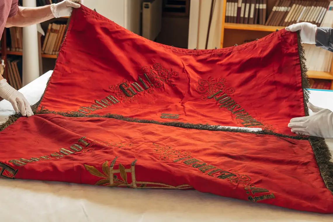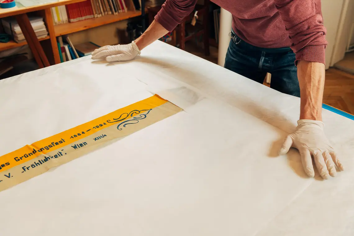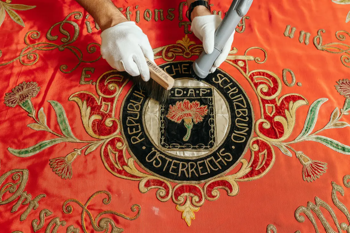 Behutsam heben Restaurator Christoph Melichar und Christian Dominguez vom technischen Service eine Fahne auf den Arbeitstisch. Aus rotem Samt genäht und aufwändig mit Goldfäden bestickt, hat sie sichtbar am Zahn der Zeit gelitten. Staub, loses Garn und ausgebleichte Stellen zeugen von suboptimaler Lagerung. Nun beginnt die Arbeit am wertvollen Textil, minutiös wird es trocken gereinigt und restauriert. Danach folgen die sorgfältige Verpackung und Inventarisierung, bevor das Objekt an seine neue Lagerstätte im Depot gelangt. Auf diese oder ähnliche Weise wurden in den vergangenen Monaten bereits hunderte Sammlungsstücke in den ersten beiden von insgesamt 23 Bezirksmuseen und sechs Sondermuseen versorgt. Der Fokus des Depotprojektes liegt dabei vorrangig auf Gegenständen aus Stoff: „Dabei handelt es sich um die heikelsten Objekte mit dem größten Handlungsbedarf“, so Regina Wonisch, Leiterin der Stabstelle Bezirksmuseen im Wien Museum.