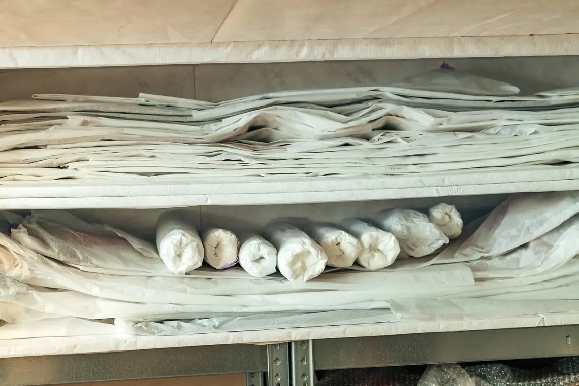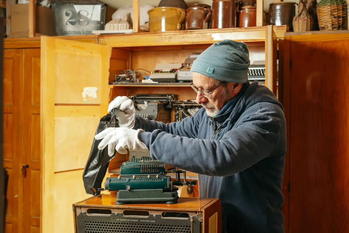 Auch wenn das Hauptaugenmerk auf empfindlichem Textil liegt, wird der Blick auf die gesamte Depotsituation bewahrt. Von Schreibmaschinen über archäologische Artefakte bis hin zu Fotos und historischen Geschäftsausstattungen ist hier vieles zu finden. „Für mich sind alle Objekte wichtig“, sagt Christoph Melichar.