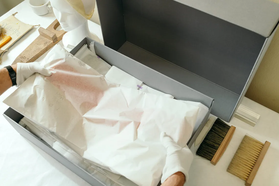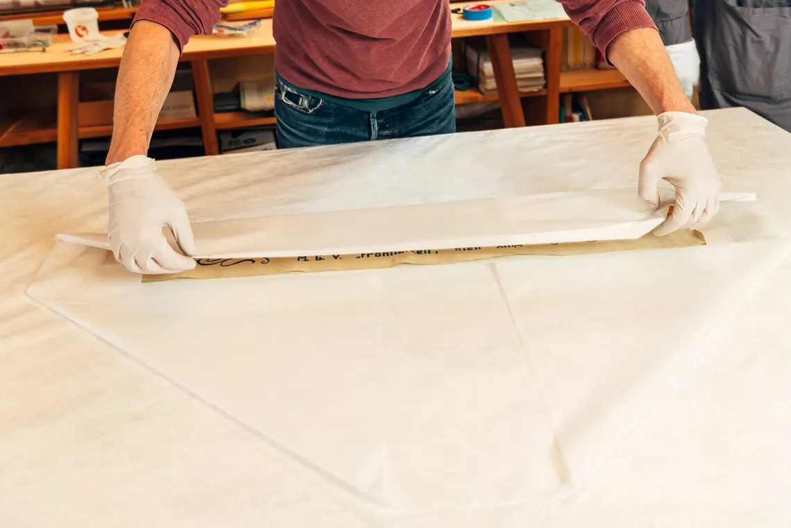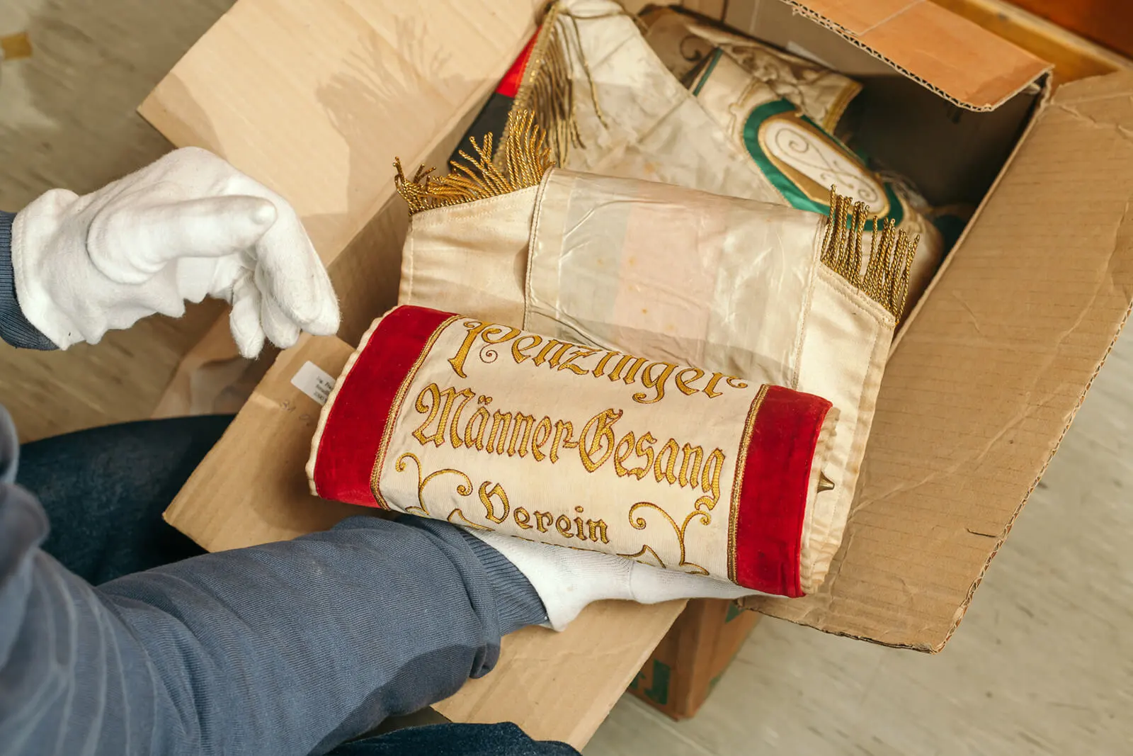 Für Jahrzehnte waren manche Konvolute in Kisten verstaut. Etwa diese Sammlung an Fahnenbändern im Bezirksmuseum Penzing. Nun wird diese fachmännisch sortiert und einzeln verpackt.