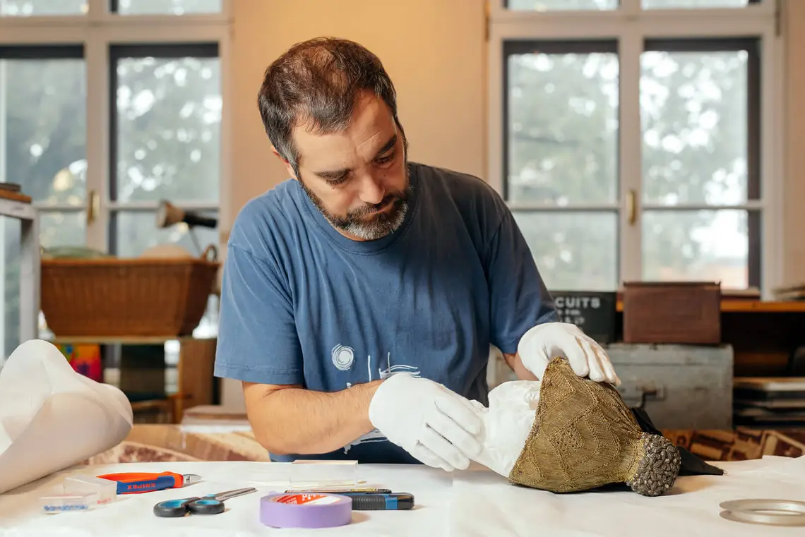 Höchste Sorgfalt. „Unsere Arbeit ist von größtem Respekt vor dem Material geprägt“, so Christian Dominguez, hier bei der Arbeit an einer Goldhaube im Bezirksmuseum Liesing.