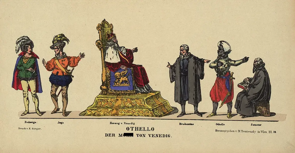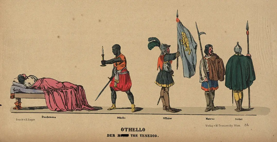 Das Stück Othellerl. Der M* von Wien (1829) von Carl Meisl bring uns ins Vorstadttheater. Dort machte man sich über alles lustig, was in der Stadt passierte. Besonders gerne wurden prominente Theaterstücke parodiert. Und so wurde auch Othello parodiert und mitten in die Wiener Gesellschaft verpflanzt. Er wird zum ‚Typ von nebenan‘, der mit den anderen Wiener Typen um die Gunst der weiblichen Bevölkerung buhlt. In der Eröffnungsszene fällt der Satz „Itzt kommen d’M* in d’Mod“, was offensichtlich doppeldeutig gemeint ist. Einerseits geht es darum, Schwarze Figuren vermehrt auf den Bühnen der Zeit auftauchen, und andererseits sehen die beiden männlichen Gegenspieler den Othello plötzlich als Konkurrenz, der am Ende das angebetete Desdemonerl abbekommt – während sie leer ausgehen.