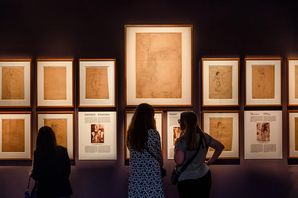 Unterschiede ergeben sich einerseits über die verschiedenen Raumsituationen: In Berlin geben die kleinteiligen Räume des historischen Gebäudes gewisse Zwänge vor. In Wien können wir im neuen Sonderausstellungsraum im obersten Stockwerk ganz eigene Architekturen für die Ausstellung einbauen. Andererseits liegt in Berlin ein größerer Schwerpunkt auf Klimt. Hier hat es noch nie zuvor eine Klimt-Ausstellung gegeben, Ralph wollte den Berliner Besucher:innen deshalb einen Überblick über dessen Werk präsentieren. Das müssen wir in Wien nicht machen, da es hier viele Museen gibt, wo Klimt ständig zu sehen ist. Ich habe zum Beispiel über 40 Zeichnungen von Klimt für Berlin ausgewählt, die in Wien nicht ausgestellt werden, hier konzentrieren wir uns auf einige wenige Ölgemälde von ihm.