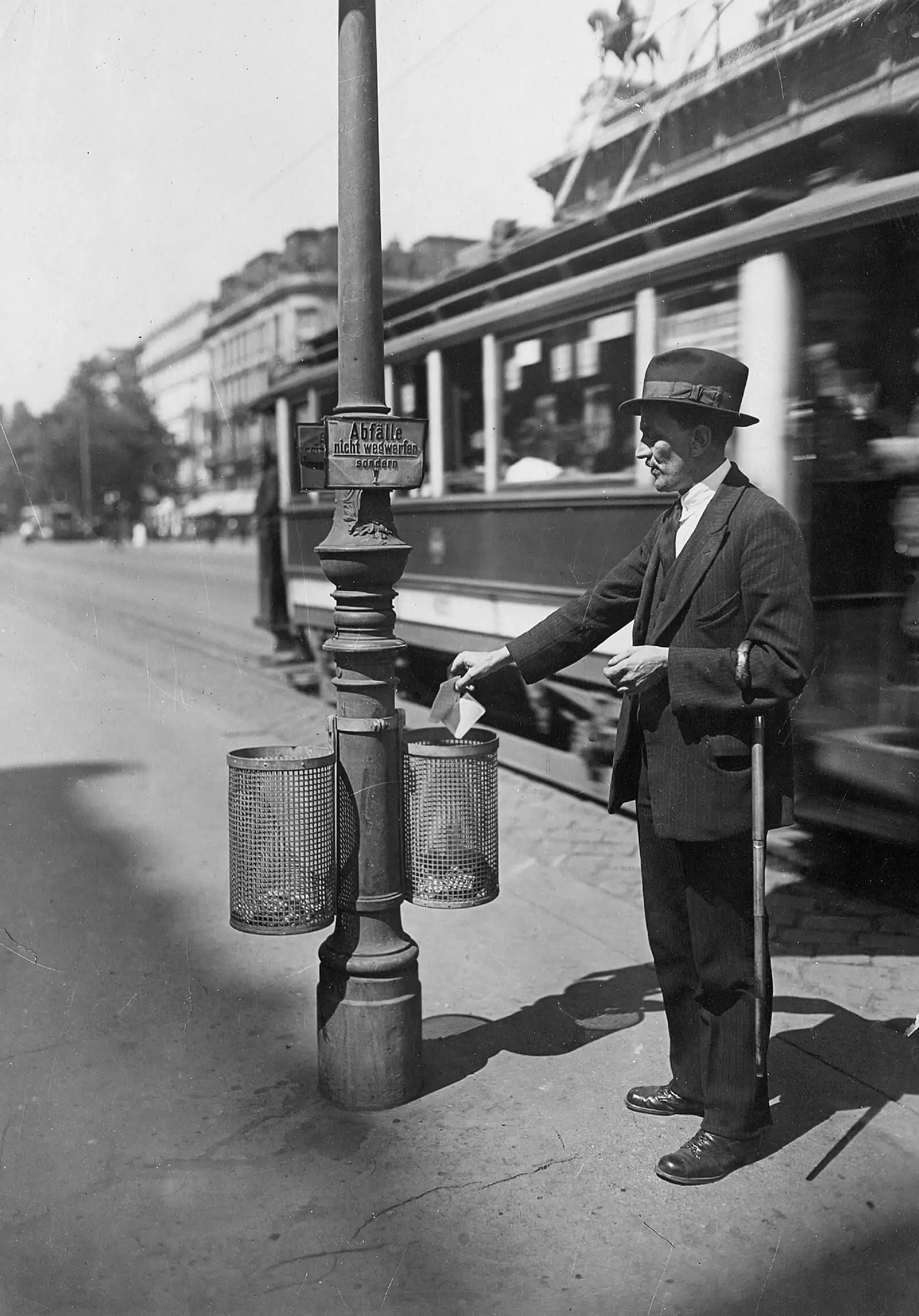 Dem Diktum der Sauberkeit trug auch die Einführung eines neuen Stadtmöbels Rechnung. Im Jahr 1924 begann man mit der flächendeckenden Aufstellung von rund 6.000 „Abfallsammelkörben“. Zylindrisch, aus durchbrochenem Eisengitter geformt, waren sie an den Masten von Beleuchtungskörpern oder Verkehrsschildern montiert, darüber wies ein Schild mit der Aufschrift „Abfälle nicht wegwerfen, sondern ...“ auf den Zweck derselben hin. Die Wiener Polizei war angewiesen, Zuwiderhandelnde konsequent zu bestrafen.