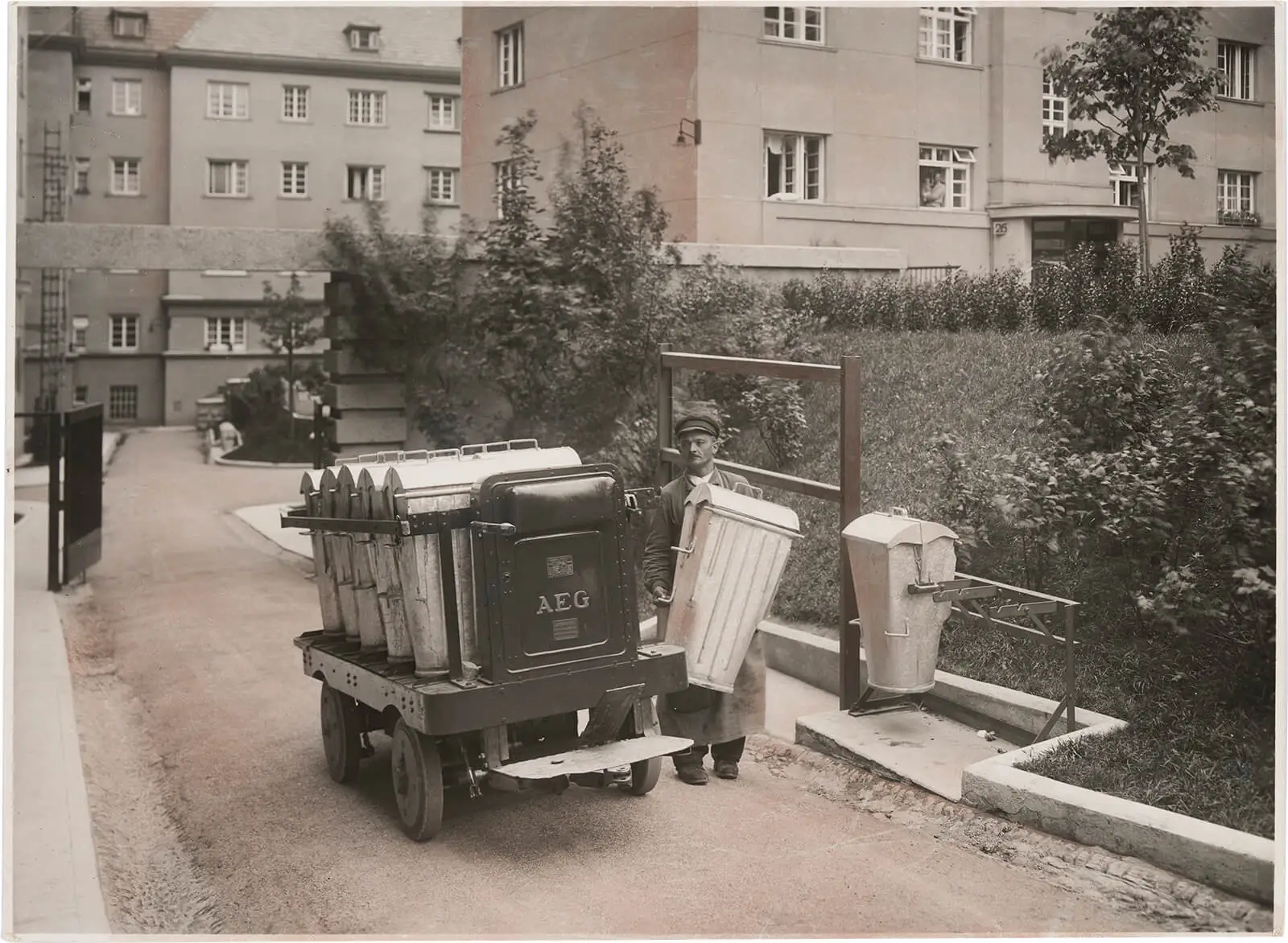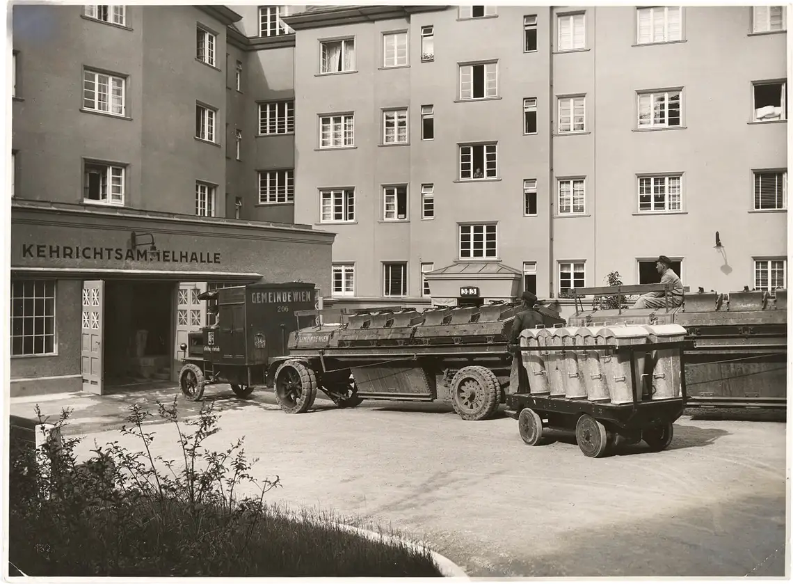 In einigen kommunalen Wohnanlagen baute man sogar große „Kehrichtsammelhallen“. Etwa im Sandleitenhof, wo ein Arbeiter mit einem Elektrokarren die Manipulation der vollen Kübel bewerkstelligte. Die Halle war aus hygienischen Gründen mit Kacheln verkleidet und hatte einen Ventilator eingebaut, um Geruchsbelästigungen zu vermeiden.