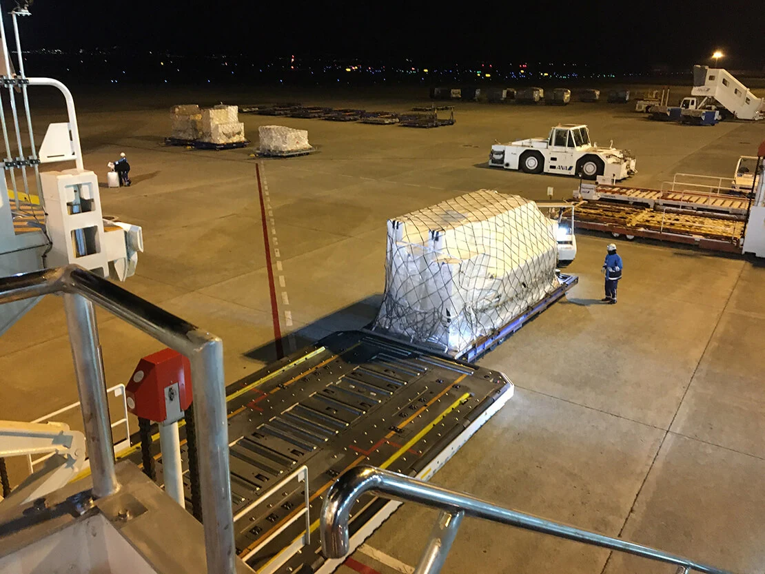 Nachdem auch die anderen Kunstwerke in Kisten verpackt waren, erfolgte die Verladung in den LKW und der Direkttransport zum Flughafen. Im Cargo-Bereich wurde auf Spezialpaletten umgeladen, die „Dame in Gelb“ reist nämlich stets aufrecht und parallel zur Flugzeugaußenwand. Kein Moment des Alleinseins wurde ihr gewährt, neben dem Kurier wurde sie wie ein VIP immer auch von einem Supervisor der japanischen Kunstspedition überwacht.