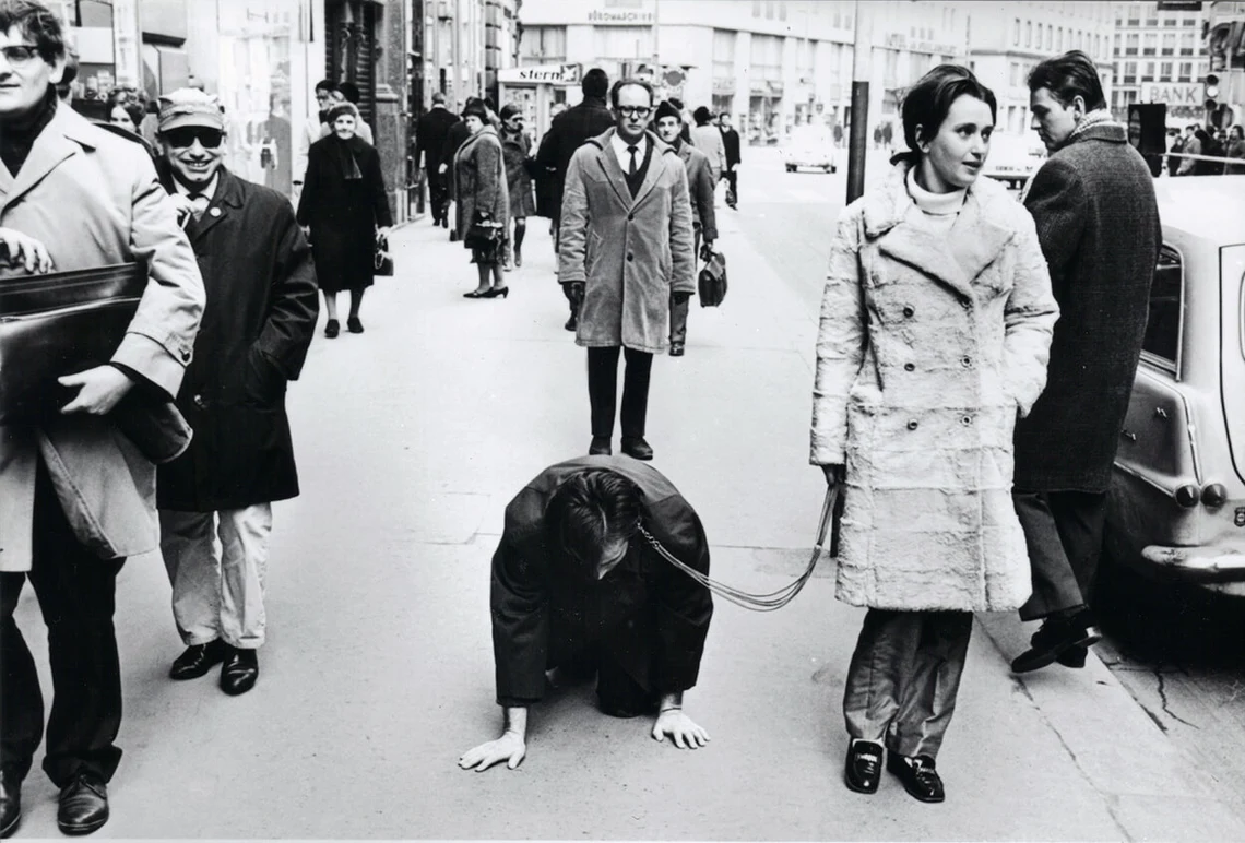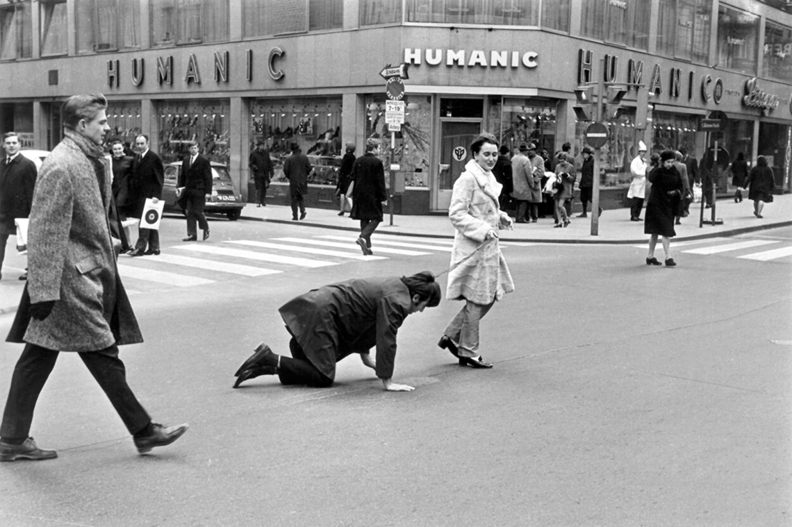Eine weitere Aktion, in der VALIE EXPORT mit Machtverhältnissen spielte und diese umdrehte, war „Aus der Mappe der Hundigkeit“. Sie führte den Künstler Peter Weibel an einer Leine durch Wien. Dieser musste wie ein Hund auf allen Vieren kriechen.