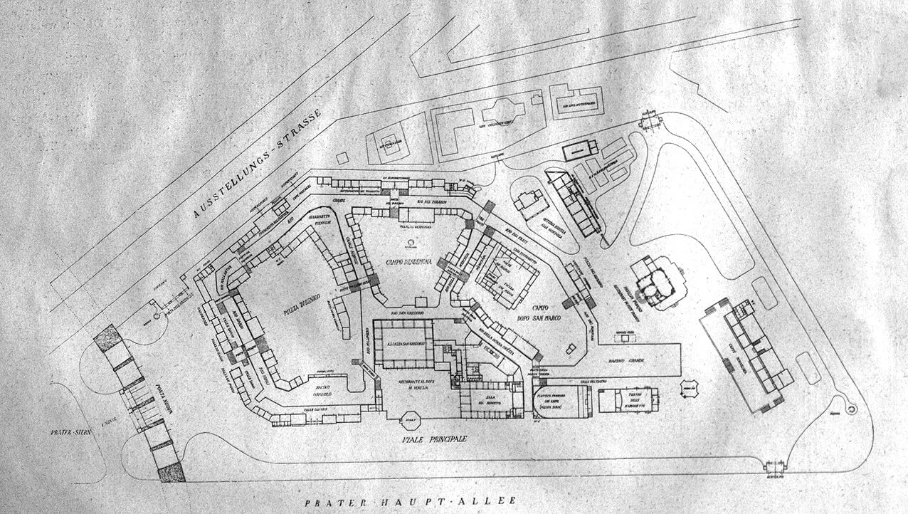 Der Architekt Oskar Marmorek schrieb in einer Fachzeitschrift über seinen gestalterischen Ansatz: „Es ist keine Copie eines bestimmten Platzes, sondern gleichsam eine Paraphase von Venedig. Jedes einzelne Haus ist entweder direct eine Copie oder nach einem bestimmten Venetianer Grundmotiv gezeichnet.“ Besonderen Wert legte Marmorek auf die Kopien des Palazzo Ca’ d’Oro, des Palazzo Vendramin (Sterbehaus Richard Wagners) und des Klosterhofs der Abbazia San Gregorio. Doch trotz solider Gebäude konnte man auf gemalte Ansichten nicht verzichten. Da der Markusplatz einfach zu groß war, um ihn zu kopieren, wurde er als Art Diorama präsentiert. Das Panorama mit der Kirche von San Marco und der Piazzetta, gemalt vom k. k. Hof-Theatermalerunternehmen J. Kautsky Söhne & Rottonaro, zeigte sogar Tauben, welche die Markuskirche umkreisen.