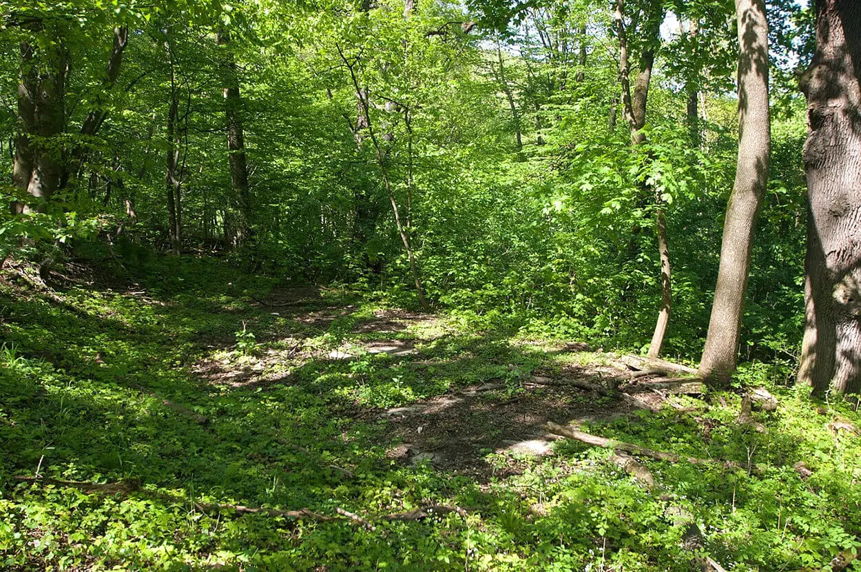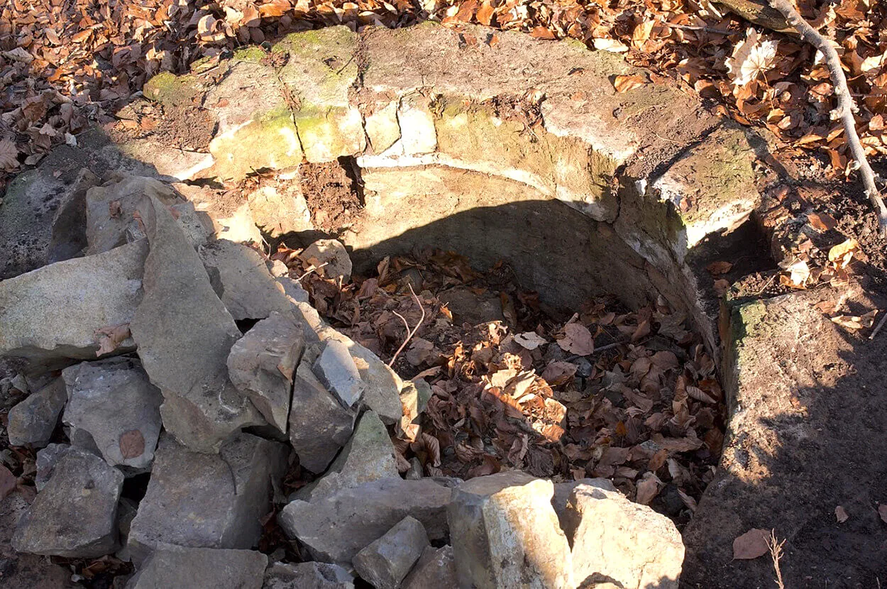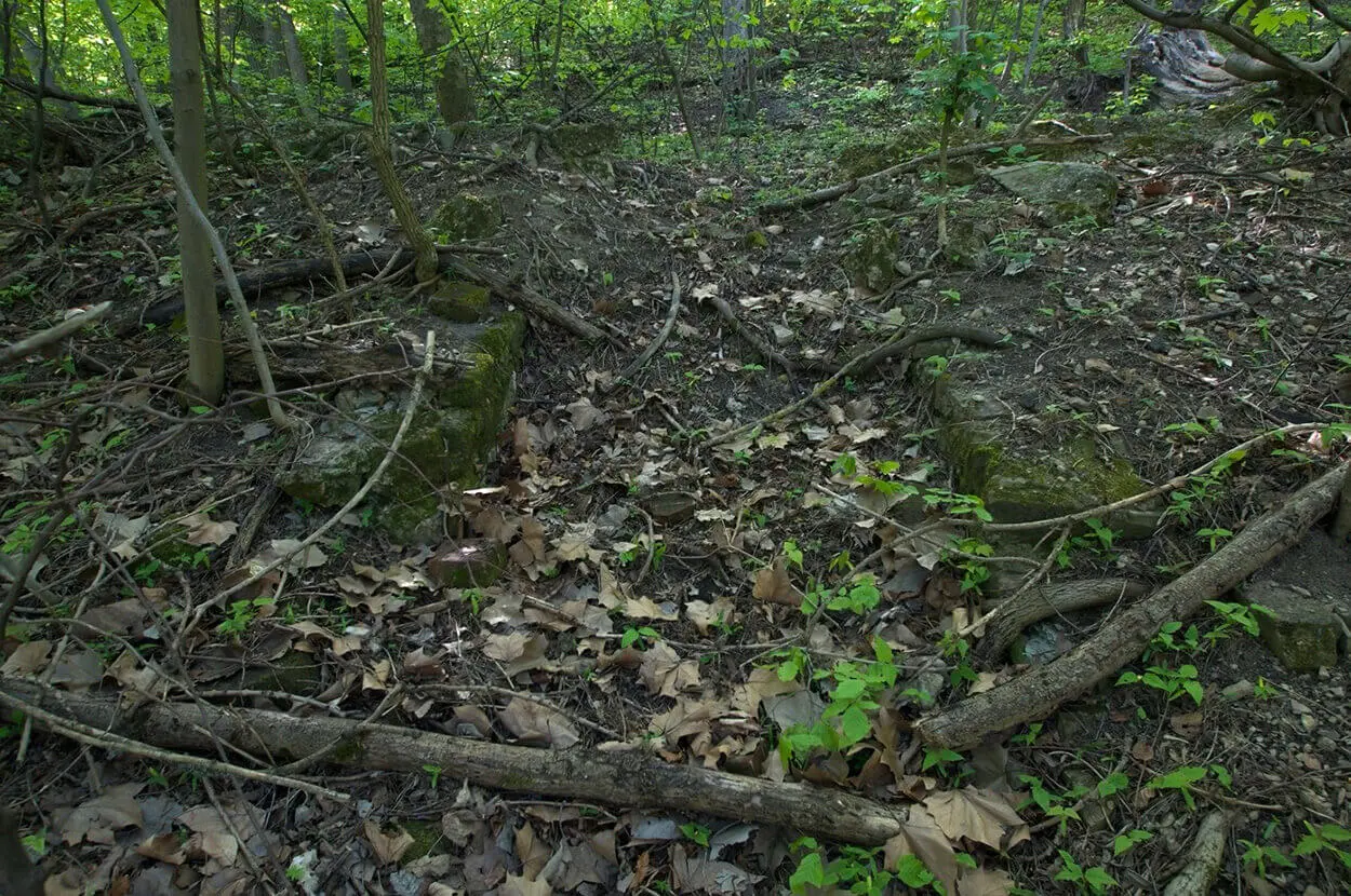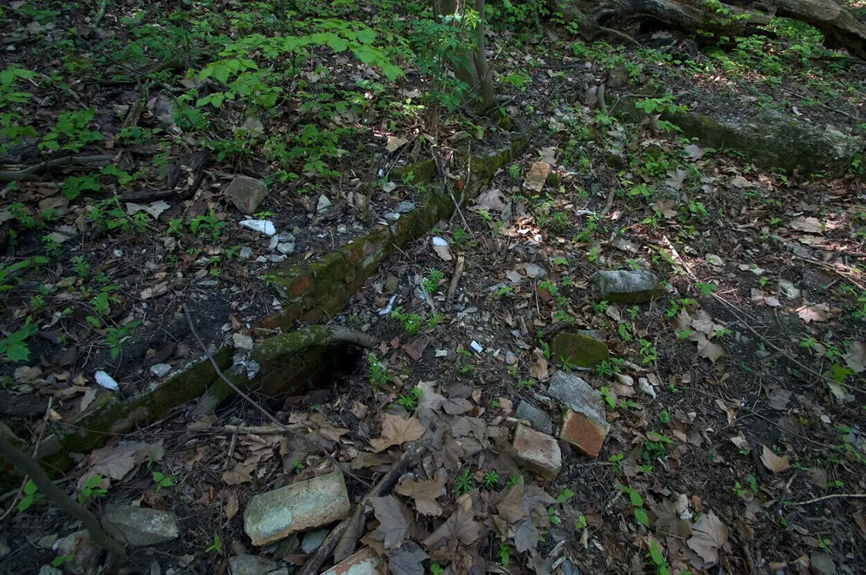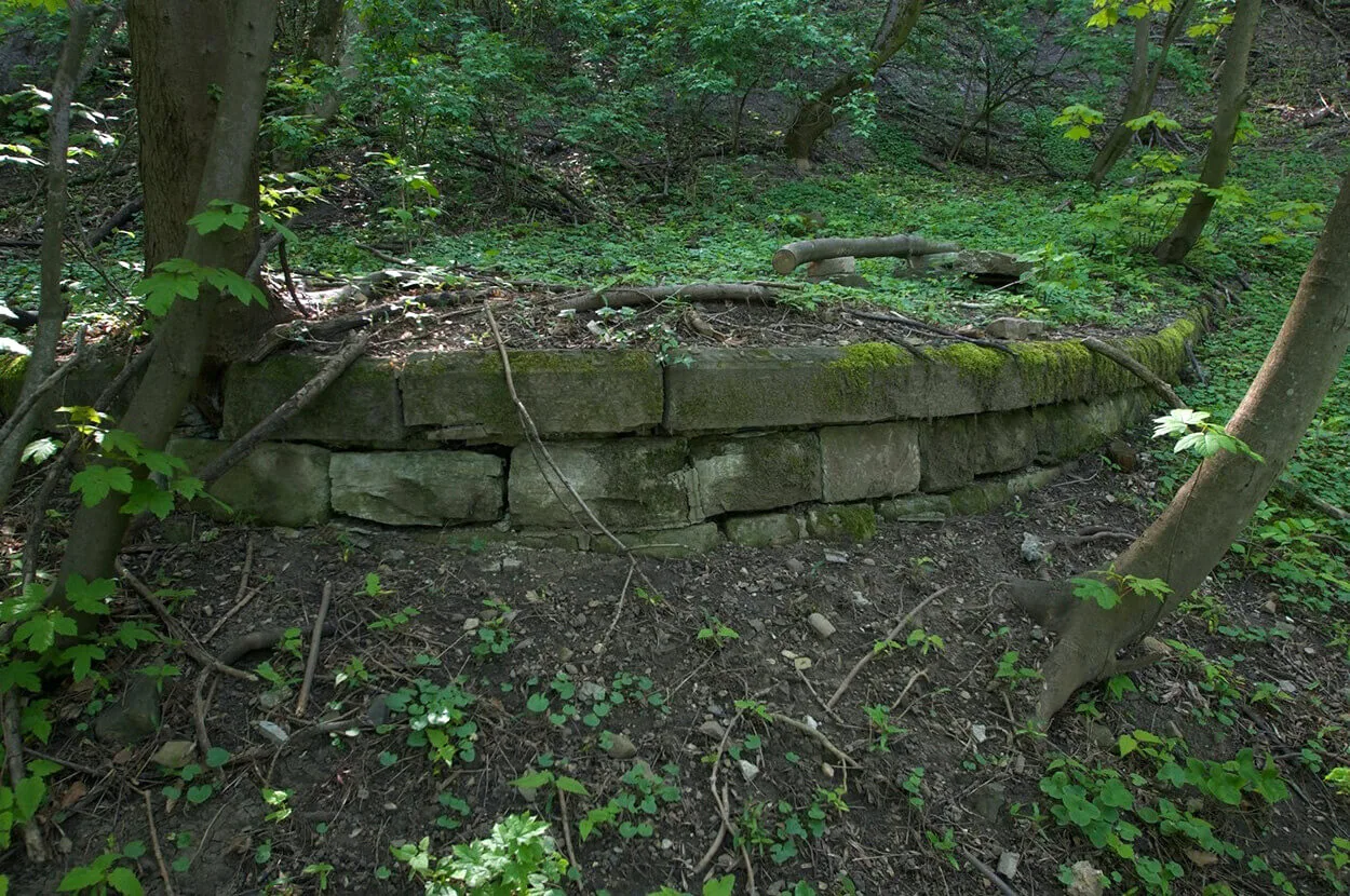 Südlich des Hauptgebäudes ist in obiger Karte am Kreuzungspunkt zweier Gartenwege eine längliche rot umrahmte Fläche zu erkennen. Meines Erachtens handelte es sich dabei um ein Gewächshaus, dessen Reste noch heute in der Natur zu entdecken sind. Das erste Bild unten zeigt den kurzen Zugangsweg von Osten, der links und rechts der Bildmitte von niedrigen moosbewachsenen Ziegelmauern eingefasst wird. Das zweite Bild zeigt die Grundmauern des von mir angenommenen Gewächshauses. Ob ich mit dieser Vermutung Recht habe oder nicht, wird möglicherweise eines fernen Tages die Wiener Stadtarchäologie feststellen.