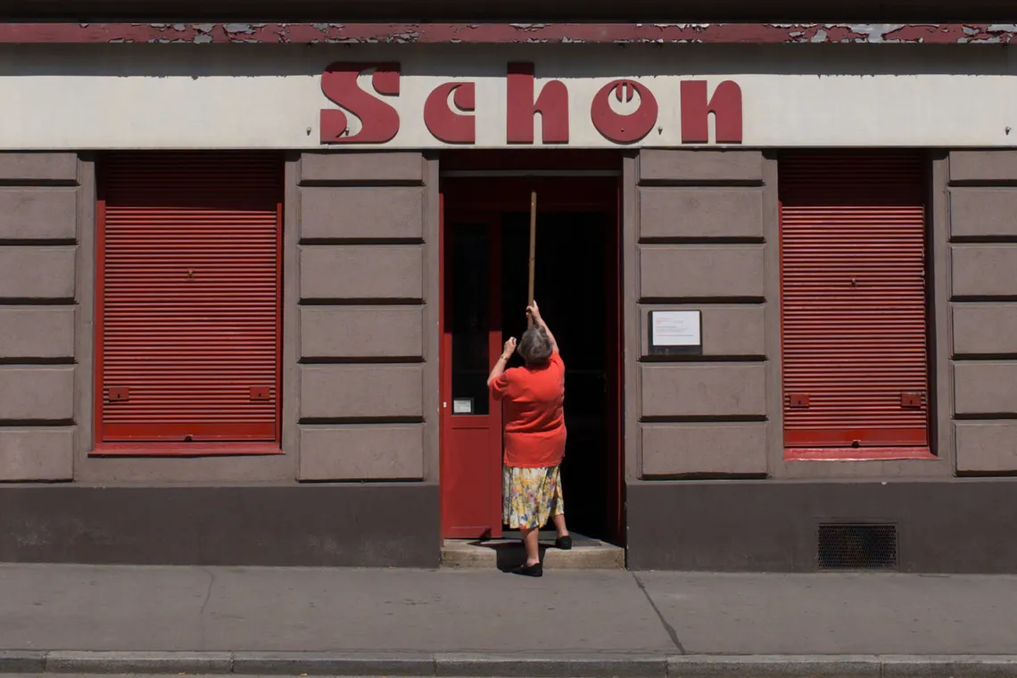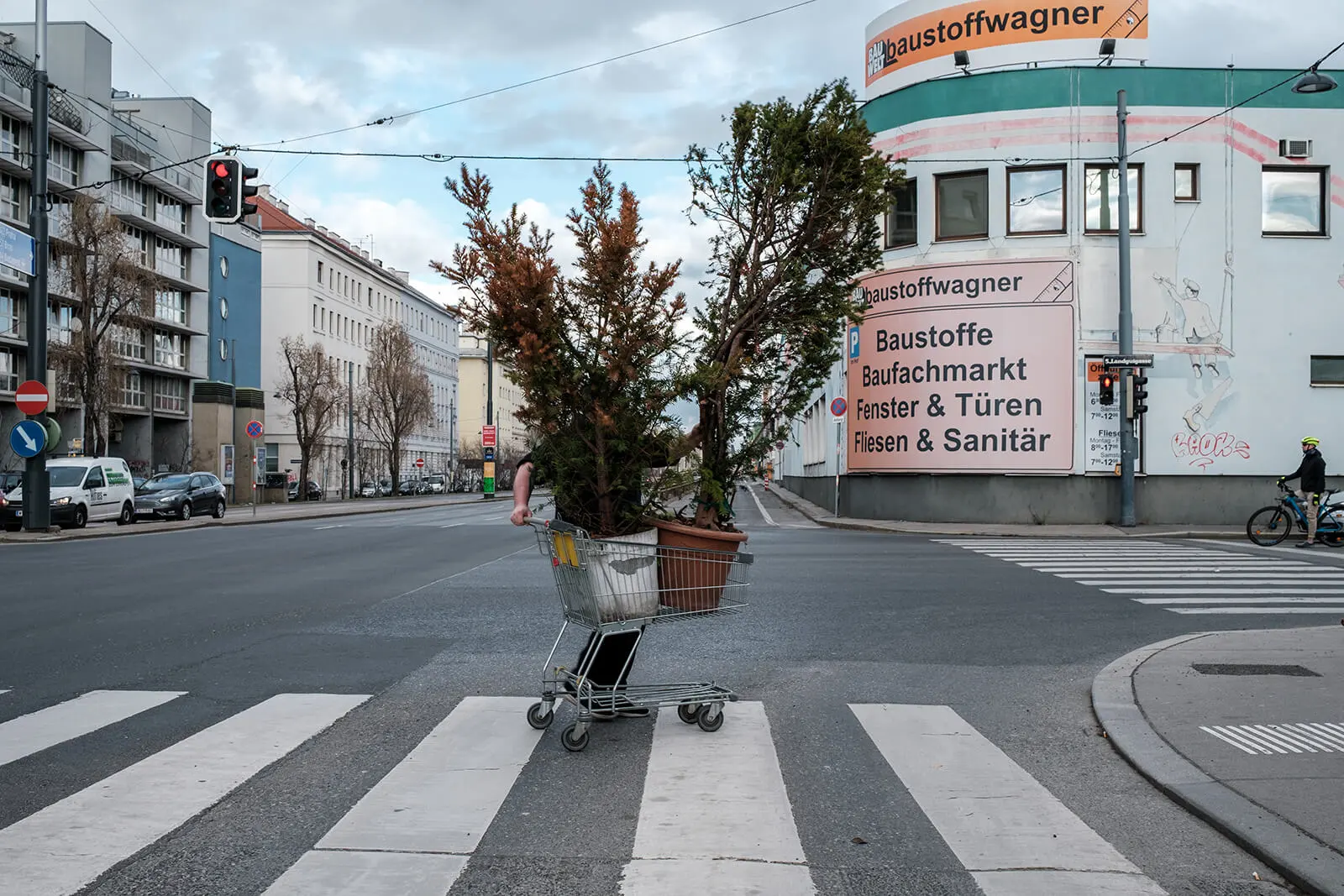Die Wiener Straßenfotografie steckt voller Nostalgie, wie Anton Holzer, Kurator der Ausstellung, festgestellt hat. Es herrscht ein Topos der Langsamkeit, Gemütlichkeit statt Hektik, grau in grau statt Farbe. Immer noch wird gerne schwarz-weiß fotografiert. Viele entdecken gerade die Analogfotografie neu und entwickeln die Filme teilweise selbst. Die Scans davon werden wiederum auf Insta gepostet. Die meisten Aufnahmen entstehen auf Spaziergängen durch die Innenstadt, weil dort immer interessante Menschen unterwegs sind und die historischen Bauten ein schöne Kulisse bieten. Kaffeehäuser spielen eine große Rolle, ebenso die Einkaufsstraßen. Wir haben uns in der Jury bemüht, auch Fotos aus anderen Bezirken auszuwählen, um verschiedene Facetten von Wien zu zeigen. Mitunter ist das sehr lustig, wie die Sau in der Wirtshaustür im Böhmischen Prater. Manchmal wiederholen sich ganze Szenen: Bei Franz Hubmann gibt es eine Pflanze, die im Kinderwagen über die Straße geschoben wird, bei Fuat Altintaş sind es zwei im Einkaufswagen. Didi Sattmann hat drei Buben beim Sprung ins Wasser in der Seestadt festgehalten, Christian Fischer entdeckt acht Jahre später drei mit ähnlichen Badehosen am selben Ort. Manches hat sich auch verändert. Wer wartet, schaut heute auf sein Telefon.