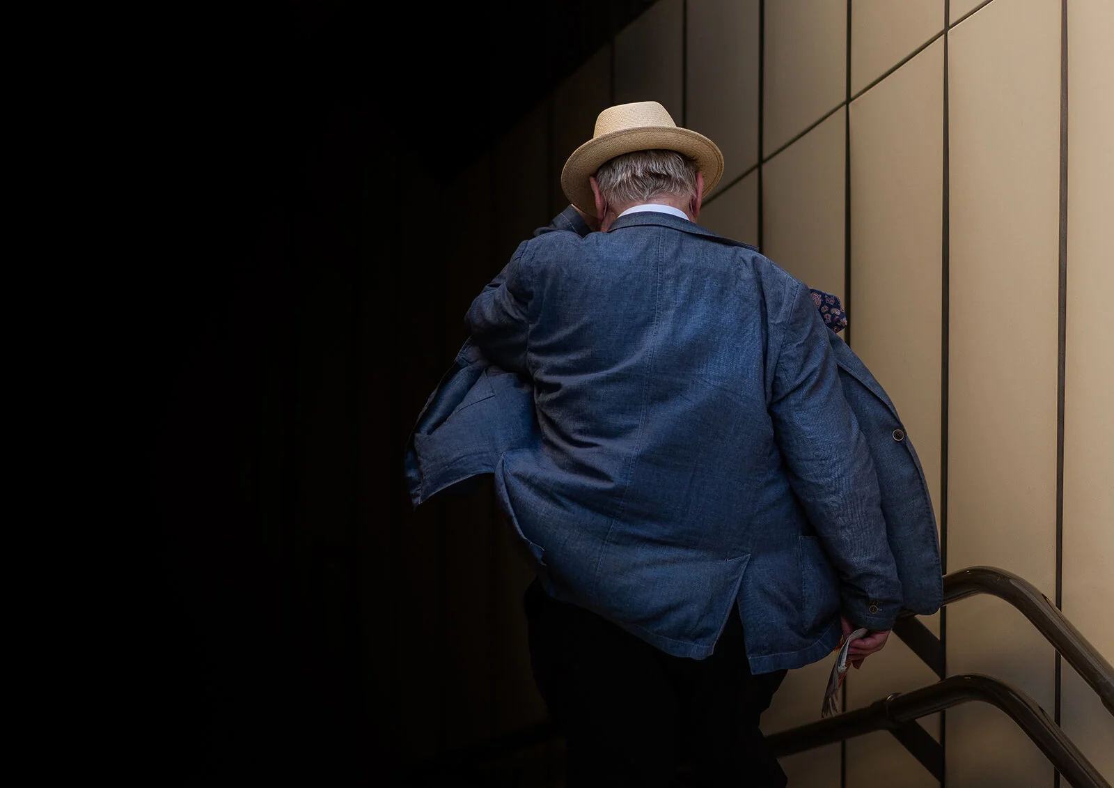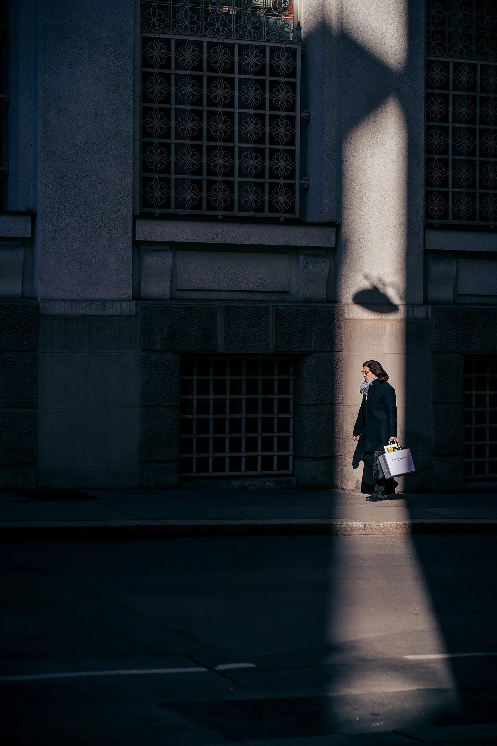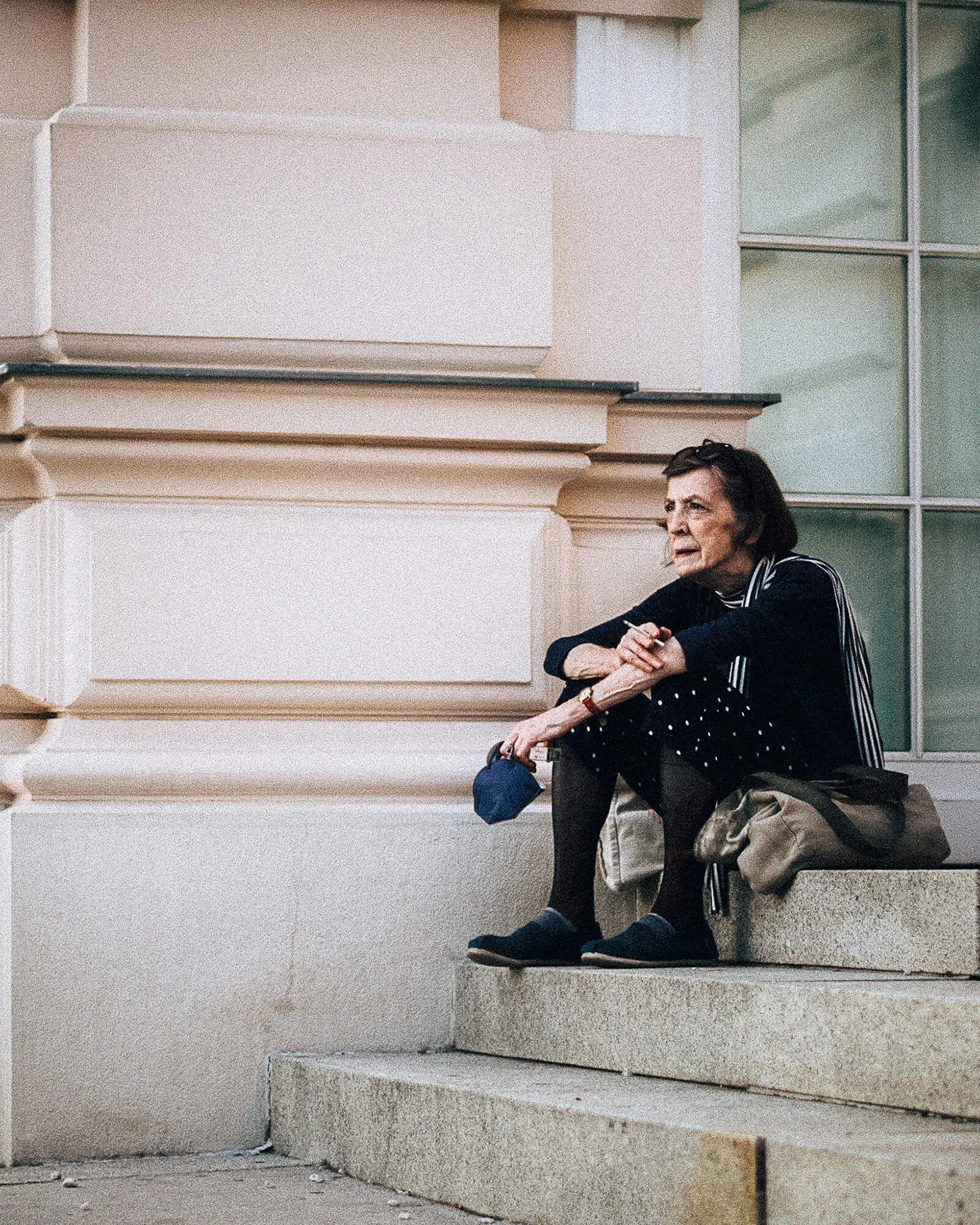 Street Photography bedeutet in der puristischen Auslegung, die abgelichteten Menschen gar nicht zu fragen, weil unbeobachtet die stärksten Aufnahmen gelingen. Vor allem in den USA ist dieser Zugang stark verbreitet. In Österreich gibt es ein anderes Bewusstsein für Persönlichkeitsrechte. Manche fragen bei Straßenporträts nachträglich um Erlaubnis, in einigen Situationen ist das schlicht unmöglich. Wenn man beim Fotografieren erwischt wird, empfiehlt es sich, ehrlich zu sein und wenn gewünscht die Aufnahme zu löschen. Noch einmal strenger wird die Sache bei einer Veröffentlichung auf einem Medienkanal wie Instagram. Deshalb hatten wir in den Teilnahmebedingungen die Regel, dass Personen nicht bloßgestellt werden dürfen oder in Kontexte gebracht, die sie vermutlich nicht wollen, insbesondere im Zusammenhang mit Werbung, Religion oder politischen Parteien. Ebenso sind Fotos von wiedererkennbaren Kindern tabu. Trotzdem bilden sie manchmal schwer zu wiederstehende Fotomotive. Generell sind die Instagramer:innen schon sehr dafür sensibilisiert und fotografieren Menschen deshalb von hinten. Dabei eine spannende Dynamik zu erzeugen, erfordert allerdings ein gutes Auge und Geschick. Mich hat überrascht, wie oft alte Menschen fotografiert werden und damit auf sympathische Art hervorgehoben werden.