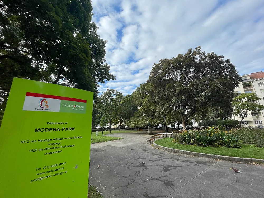 Nahe dem Heumarkt, ein wenig versteckt zwischen Neulinggasse, Beatrix- und Salesianergasse, liegt ein kleiner Park, nicht viel größer als ein Fußballfeld. Der Modenapark, im dritten Bezirk, war für meine frühen Jahre prägend. Man nennt ihn in Wien Modénapark, mit der Betonung auf der zweiten Silbe, obwohl die norditalienische Stadt, welcher der Ort indirekt seinen Namen verdankt, Módena genannt wird, mit Betonung auf der ersten Silbe. Wohl kaum jemand in Österreich aber würde Módenapark sagen. Im Jahr 1806 kaufte Maria Beatrix Riccarda von Este, Tochter des Herzogs von Modena, zwei Grundstücke in der nach ihr benannten Beatrixgasse und ließ darauf ein Schloss mit einer Gartenanlage errichten, die bis zur Strohgasse reichte. 1916 wurde das Schloss abgerissen, das Grundstück parzelliert. Der 1926 angelegte Modenapark ist nur ein kleiner Rest des einstigen Gartens.