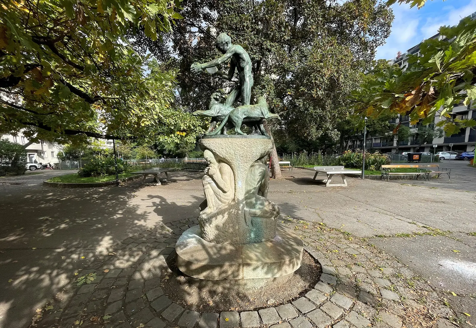 Wann immer ich konnte, nach der Schule und an jedem Wochenende, auch bei Wind und Wetter, spielte ich im Park. Ohne Spielkameraden, ohne Geschwister – ganz für mich. In der Sandkiste, und mit dem hölzernen Roller Runde nach Runde drehend. Kleine Löcher in der Parkerde aushebend, wenn wieder eine meiner kleinen Bänderschnecken mit ihren schönen dunkelbraunen Spiralbändern auf dem Gehäuse, oder einer meiner zierlichen Goldfische verstorben waren. Meine ängstliche Mutter beharrte darauf, dass das Kindermädchen auf einer Parkbank in meiner Nähe saß und über mich wachte: bis ich gut über elf Jahre alt war. Ganz selten entwischte ich Erna, wenn auch nur für höchstens zehn Minuten, dann fuhr ich im Nachbargebäude unseres Wohnhauses, das drei Stockwerke höher war, mit dem Aufzug in den neunten Stock und wieder hinunter, bis in den Keller, dann wieder ganz nach oben, dann wieder nach unten. In der Nordhälfte des Parks stand – und steht bis heute – die Skulptur eines diskuswerfenden Jungen, den zwei steinerne Panther begleiten. Als Bub kletterte ich immer auf diese Bronze-Figur hinauf, saß lange auf der Schulter des Knaben. Bis Erna mir befahl, endlich wieder herabzusteigen.