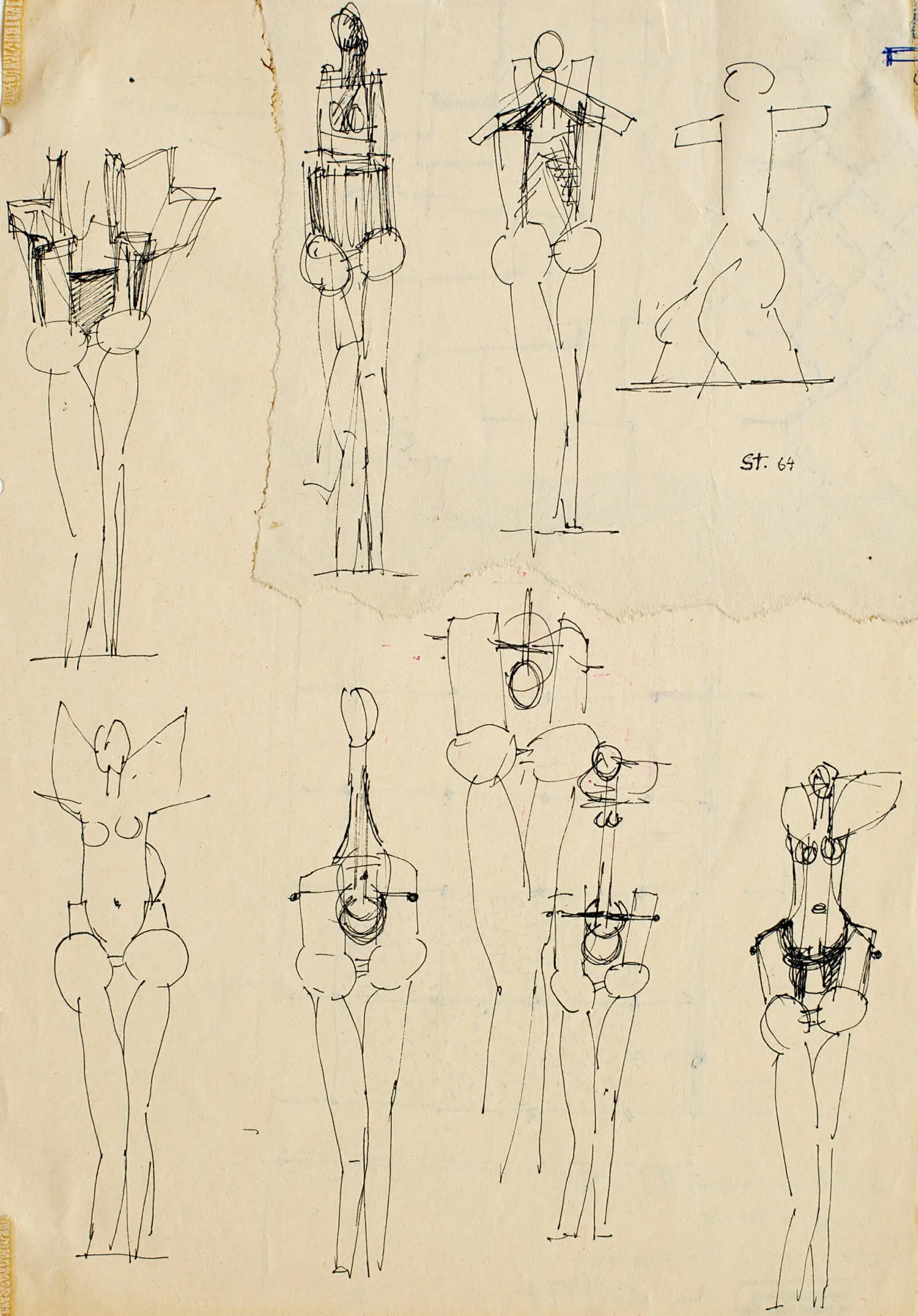 1973 kehrte der Künstler Wien erneut den Rücken zu, um einer Berufung der Academie des beaux arts nach Kinshasa, Kongo zu folgen. Neben seiner Professur näherte sich Stimm hier vor allem in seinen Zeichnungen und Aquarellen wieder figuralen Motiven an. Auch bei der Skulptur interessierte ihn nun neben abstrakten Formen erneut der menschliche Körper als Ausgangspunkt für seine Werke. Der Mensch steht auch im Zentrum der „Nouvelle Peinture Populaire“, der damals aufstrebenden kongolesischen Malerei, die als Kommunikationsmittel fungierte. Diese Malereien sollten Gespräche und öffentliche Debatten auslösen. Sie waren bunt, lebensfroh und amüsant. Oswald Stimm wird ja selbst als lebensfroh und als amüsanter Unterhalter geschildert. Nicht ohne Grund wurde der Titel seines umfassenden Werkkataloges, der 2016 erschienen ist, mit „Tänzer in der Zeit“ ergänzt. Jedenfalls wurde in den Zeichnungen und Aquarellen dieser Zeit der Alltag und das Leben in Kinshasa immer wieder miteinbezogen und mag auch Ansatzpunkt für weitere plastische Gestaltungen gewesen sein. Diese grafischen Werke bilden ein eigenes Kapitel in Stimms Oeuvre und überzeugen gerade heute mit hoher Aktualität. Auch aus dieser Phase befinden sich zwei Werke in den städtischen Sammlungen: „Ndoki“ (1976) und „Torso“ (1980) zeigen deutlich die Einflüsse aus der ihn umgebenden Kultur.