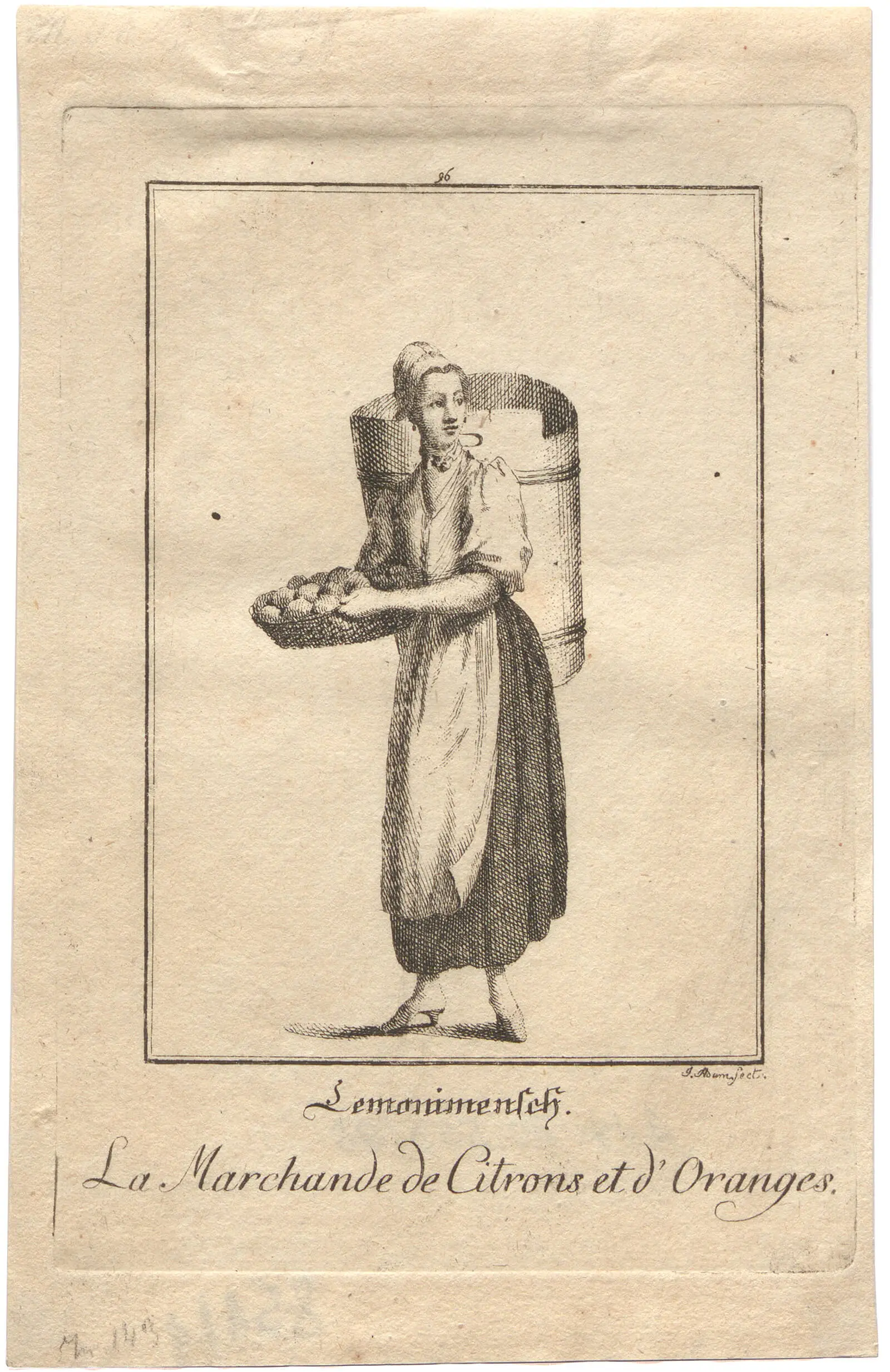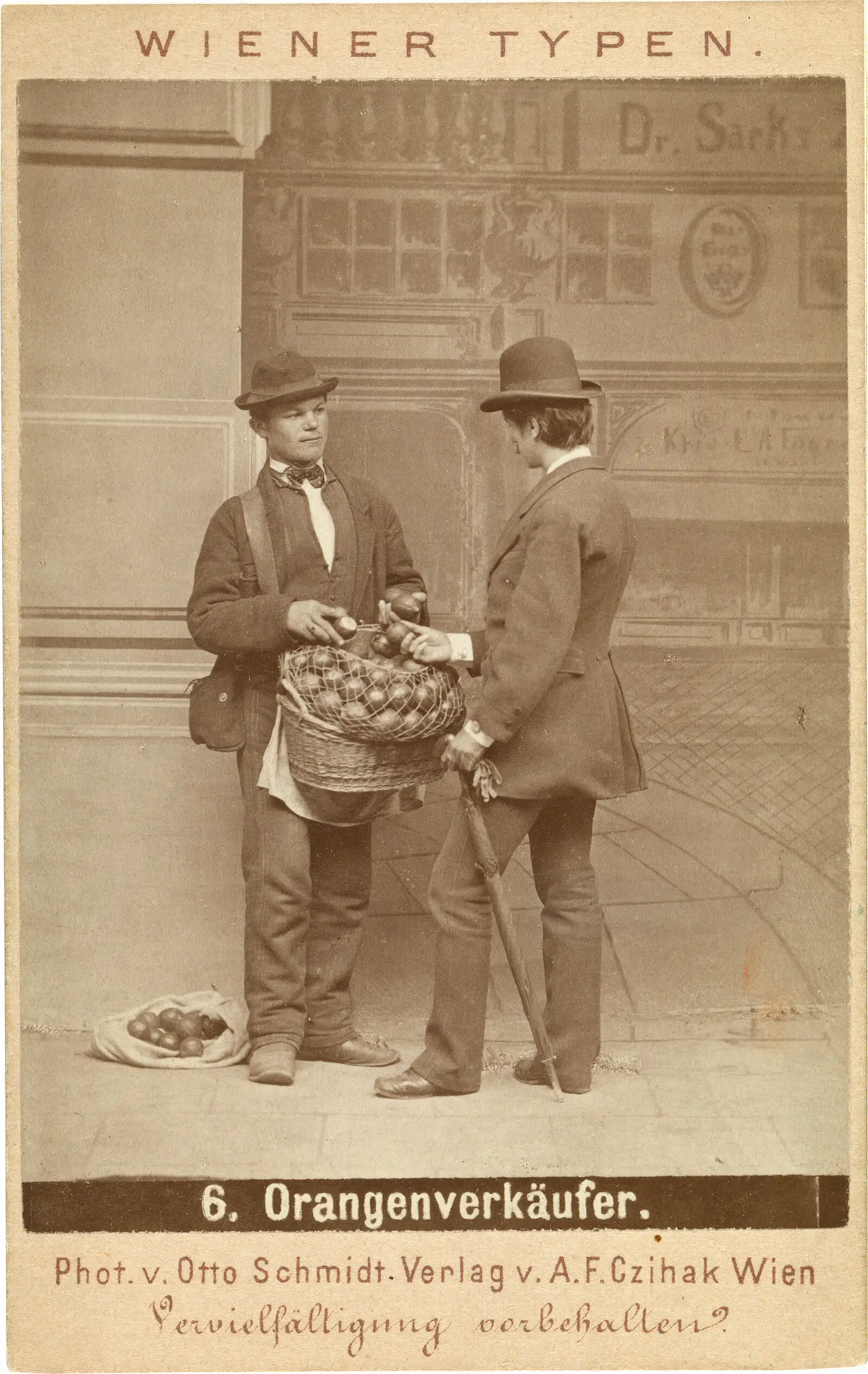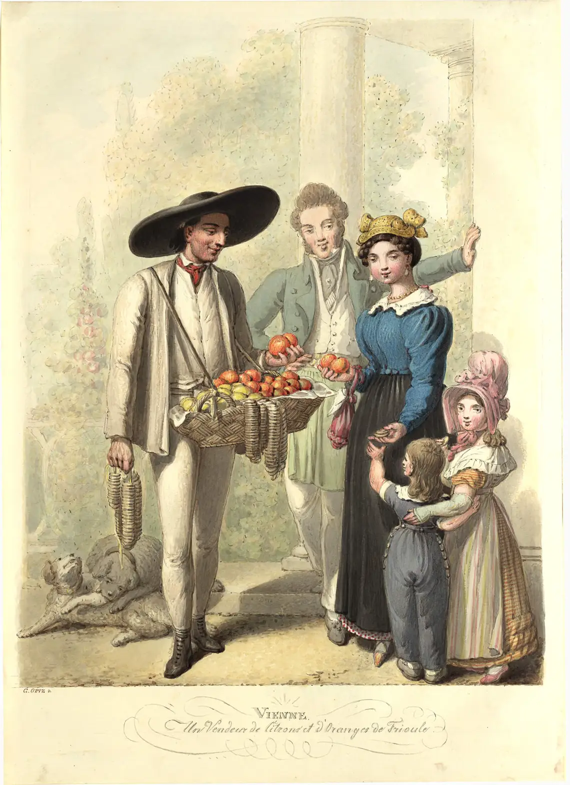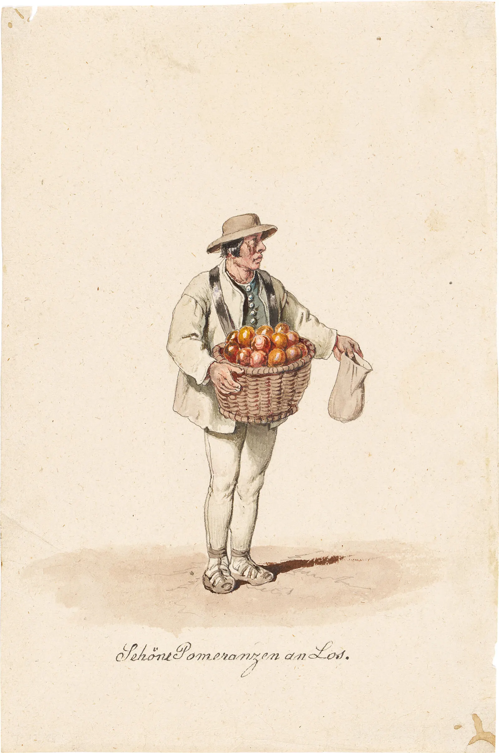 Und zum Stammpersonal der überall in der Stadt präsenten mobilen Händler, die damals die Bevölkerung mit Waren des täglichen Bedarfs versorgten, zählten auch die Lemoni- und Pomeranzenhändler. Die als „Kaufrufe“ oder „Wiener Typen“ bekannt gewordenen grafischen und fotografischen Darstellungen dieser Berufsgruppen entstanden vor allem im späten 18. und im Verlauf des 19. Jahrhunderts. Auch wenn man diese oft stereotypisierenden Bilder nicht so ohne weiteres mit historischen Realitäten gleichsetzen kann, ermöglichen sie doch einen Einblick in das typische Warenangebot dieser Zeit. Und dieses zeigt: Orangen und Zitronen gehörten ebenso dazu wie Schnecken, Krebse oder Salami. „Schöne Pomeranzen!“ rief der „Pomeranzenmann“, „Lemoni!“ das „Lemonimensch“ oder die „Limonienkrämerin“ – auch die Bekanntheit solcher Berufsbezeichnungen und Kaufrufe verweist auf die Etablierung der Zitrusfrüchte im ambulanten Handel.