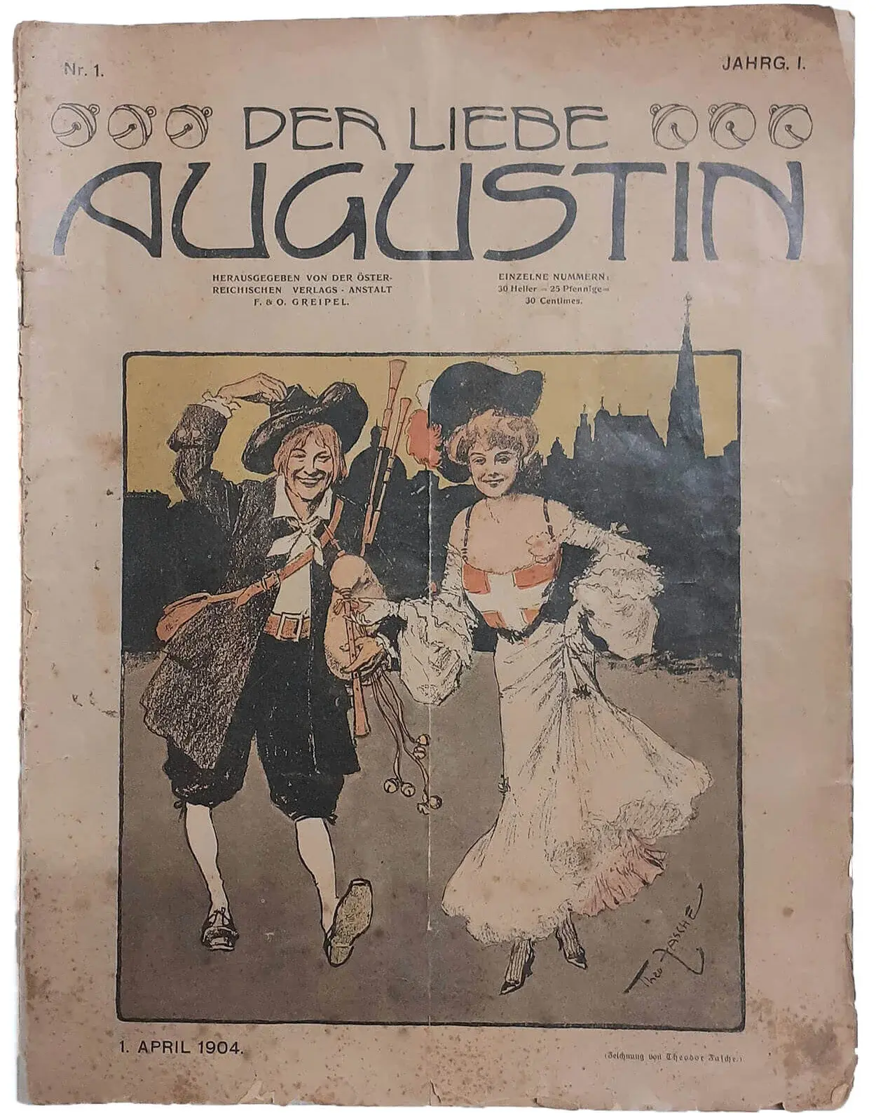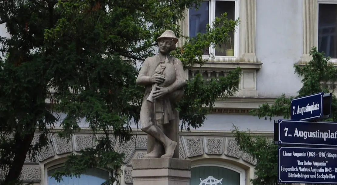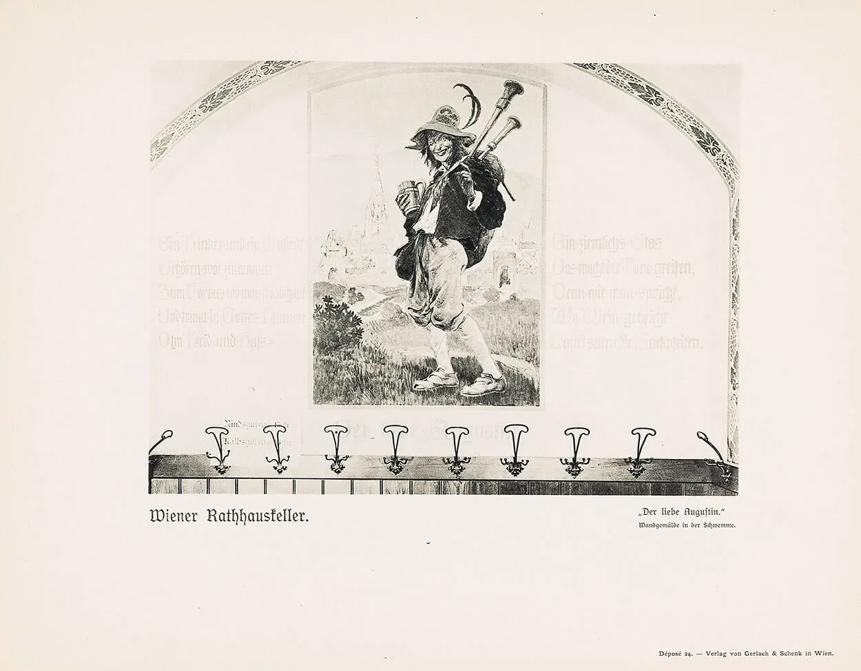 Bekanntlich war der trunkene Augustin der Sage nach in St. Ulrich eines Nachts als für tot gehalten in eine Pestgrube geworfen worden, überstand diese Episode aber erstaunlicherweise unbeschadet. Eine erste Nachricht über dieses Ereignis, das im Wiener Pestjahr 1679 stattgefunden haben soll, findet sich bei Johann Constantin Feigius („Wunderbarer Adlerschwung oder europäischer Heldenkern“, Wien 1694), tatsächlich aber handelt es sich um eine ältere Wandersage, die zuvor schon von anderen Orten beansprucht worden war. In Wien jedoch stieg die Erzählung vom unverwüstlichen und mit Galgenhumor gesegneten Musikanten zu besonderer Popularität auf. Maßgeblichen Anteil daran hatte das Buch „Alt-Wien in Geschichten und Sagen für die reifere Jugend“ von Moritz Bermann (1865), in dem die Wandersage mit dem bekannten Lied „Oh du lieber Augustin“ und einer realen Wiener Person des ausgehenden 17. Jahrhunderts, nämlich einem Max (oder Marx/Markus) Augustin, der der erste Volkssänger Wiens gewesen sei, verbunden wurde.