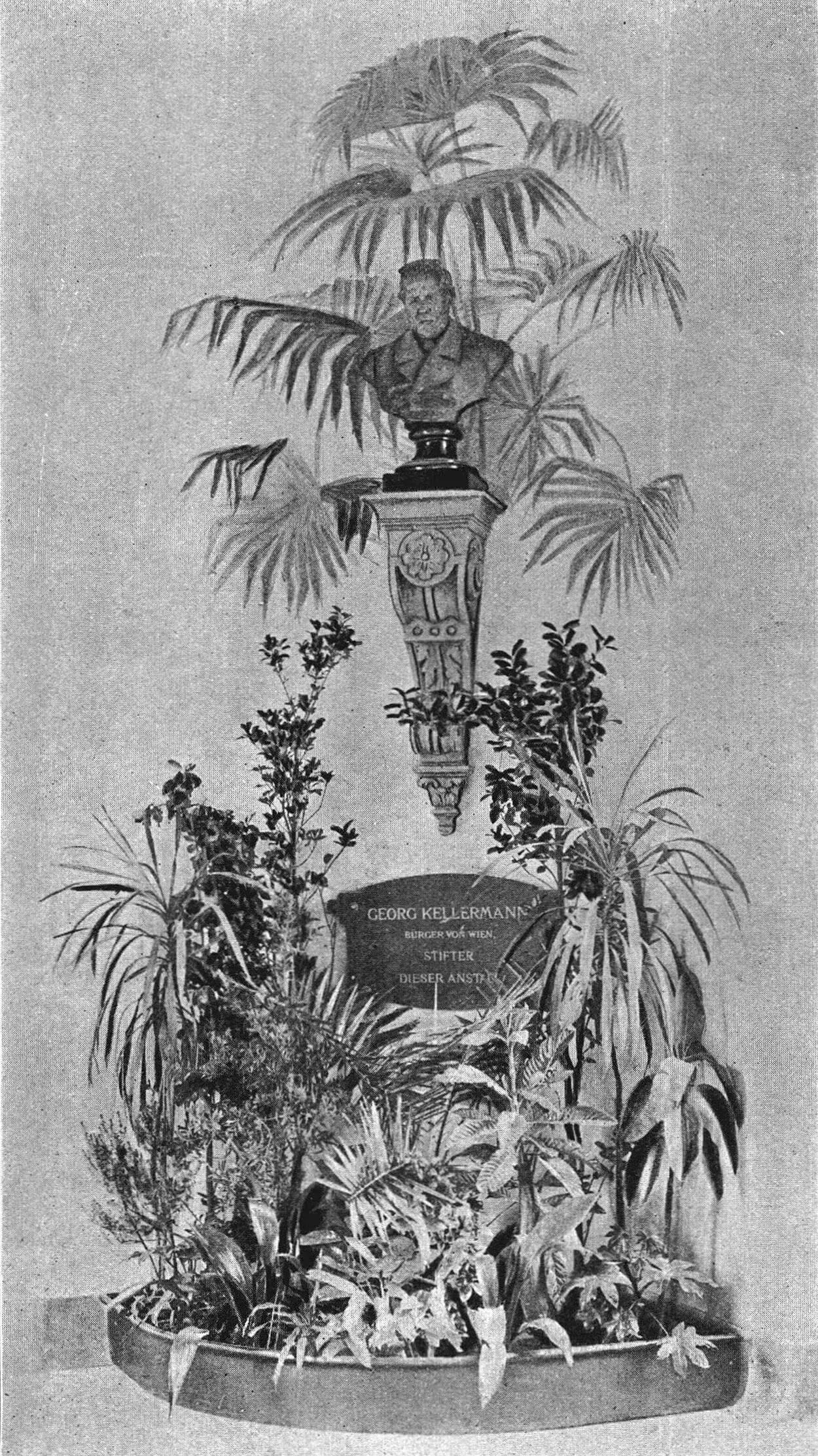 Eine formgleiche Büste aber findet sich am ebenfalls von Emanuel Pendl geschaffenen Kellermann`schen Familiengrab am Hietzinger Friedhof, das ganz auf die Person Georgs konzentriert ist. In dieser für das 19. Jahrhundert typischen Verschmelzung von Grabmal und Denkmal zumindest ist dem Stifter eine bleibende Erinnerung gesetzt. Ein grabhütender Genius, die Friedenspalme haltend, lehnt sich von links an die Büste Kellermanns, während im Vordergrund bedürftige Kinder vor den Augen des Stifters von der personifizierten Wohltätigkeit beschenkt werden. In dieser Szenerie ist eine Bedeutung Kellermanns angezeigt, die der liebe Augustin schwerlich hätte vermitteln können.