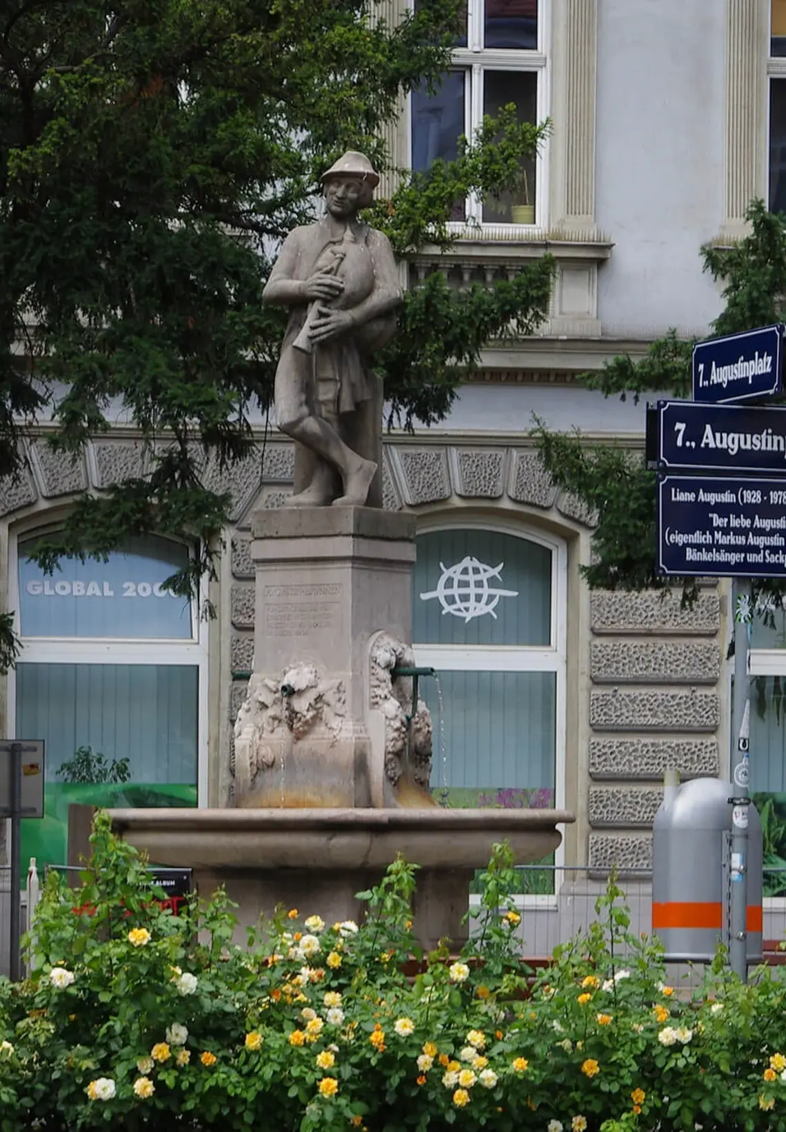 Unter den zahlreichen Fotografien von Denkmalenthüllungen aus dem frühen 20. Jahrhundert in der Sammlung des Wien Museums befindet sich auch eine von der Einweihung des Augustinbrunnens in Wien Neubau. Unter Teilnahme von Bürgermeister Karl Lueger, inmitten einer großen Menschenmenge zu sehen, wurde der von Bildhauer Hans Scherpe geschaffene Brunnen am 4. September 1908 feierlich der Öffentlichkeit übergeben. Über Stufen aus Granit und einem Postament aus Salzburger Marmor erhob sich die bronzene Figur des sagenhaften Sackpfeifers der Wiener Pestzeit: Der Bildhauer Scherpe hatte für seinen Entwurf auf der Frühjahrsausstellung des Künstlerhauses den Reichelpreis zugesprochen bekommen.